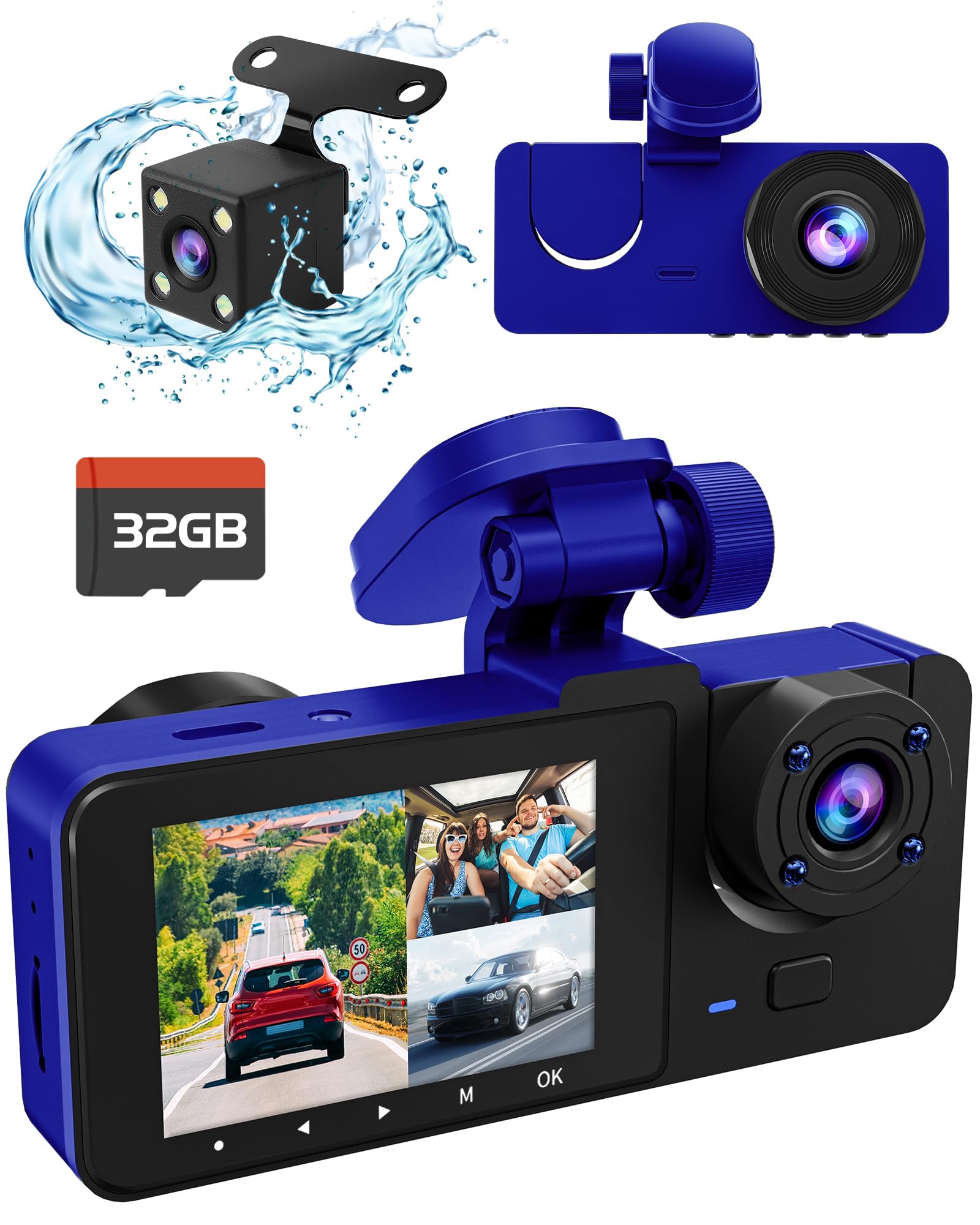 - Recording: Once powered on, the dash cam will automatically start loop recording. The screen will display live feeds from the front, interior, and rear cameras.