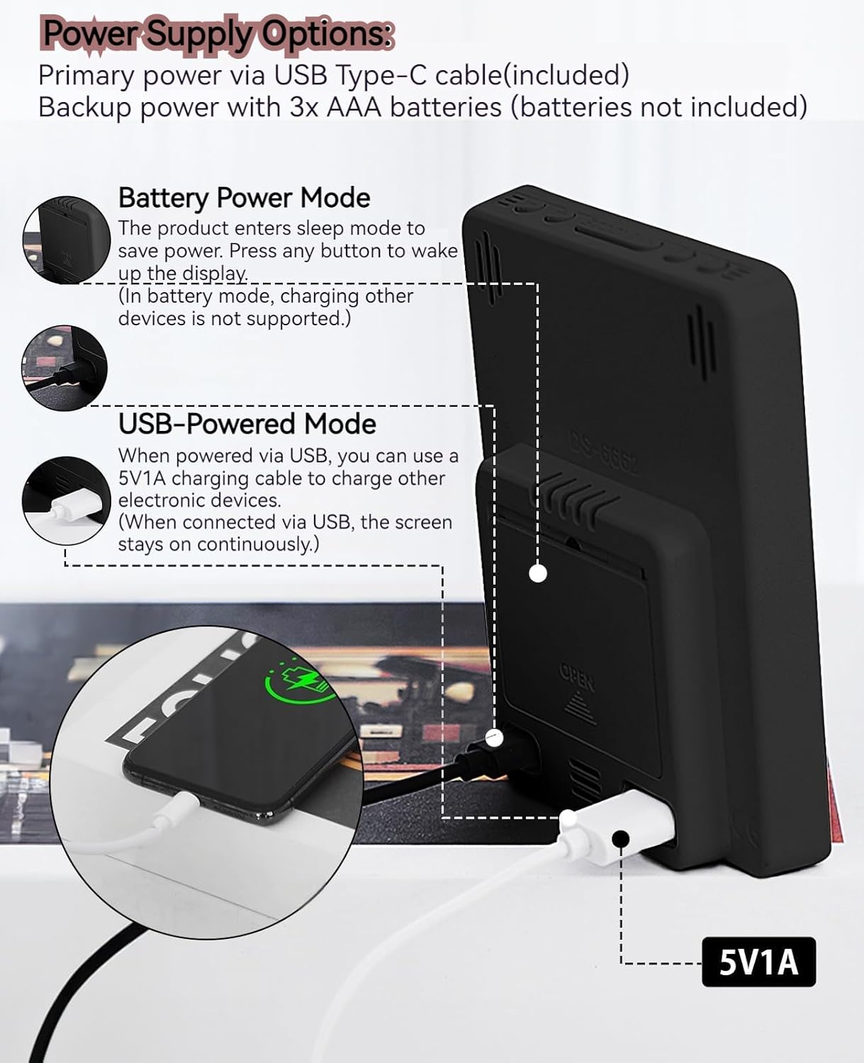- Power Source: USB Type-C (5V1A) / 3x AAA Batteries (backup)