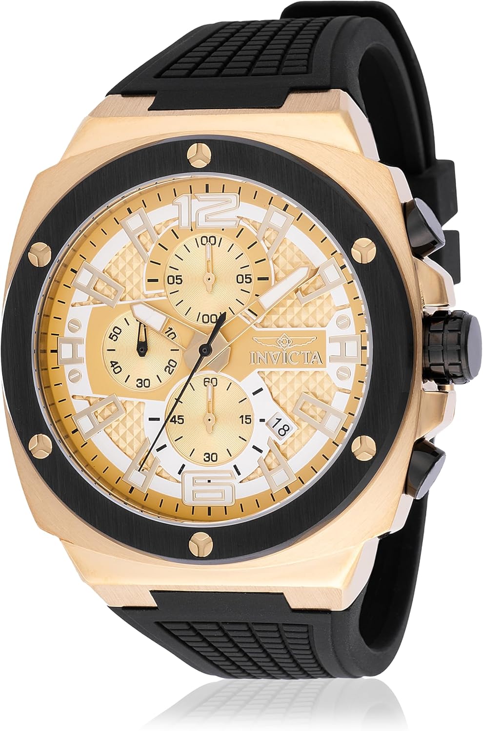 Figure 1: Front view of the Invicta Model 48165 watch, showcasing its gold dial, chronograph sub-dials, and black silicone strap.
