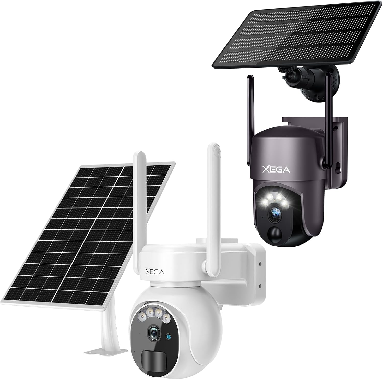 Image: The Xega 4G Camera (dark grey) and Wi-Fi Camera (white), each with its dedicated solar panel, illustrating the complete product package.