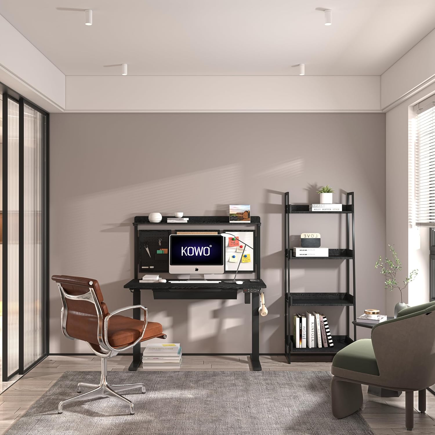 Image: The Kowo K304 Electric Height Adjustable Standing Desk with back board and drawer, shown in a modern office environment.