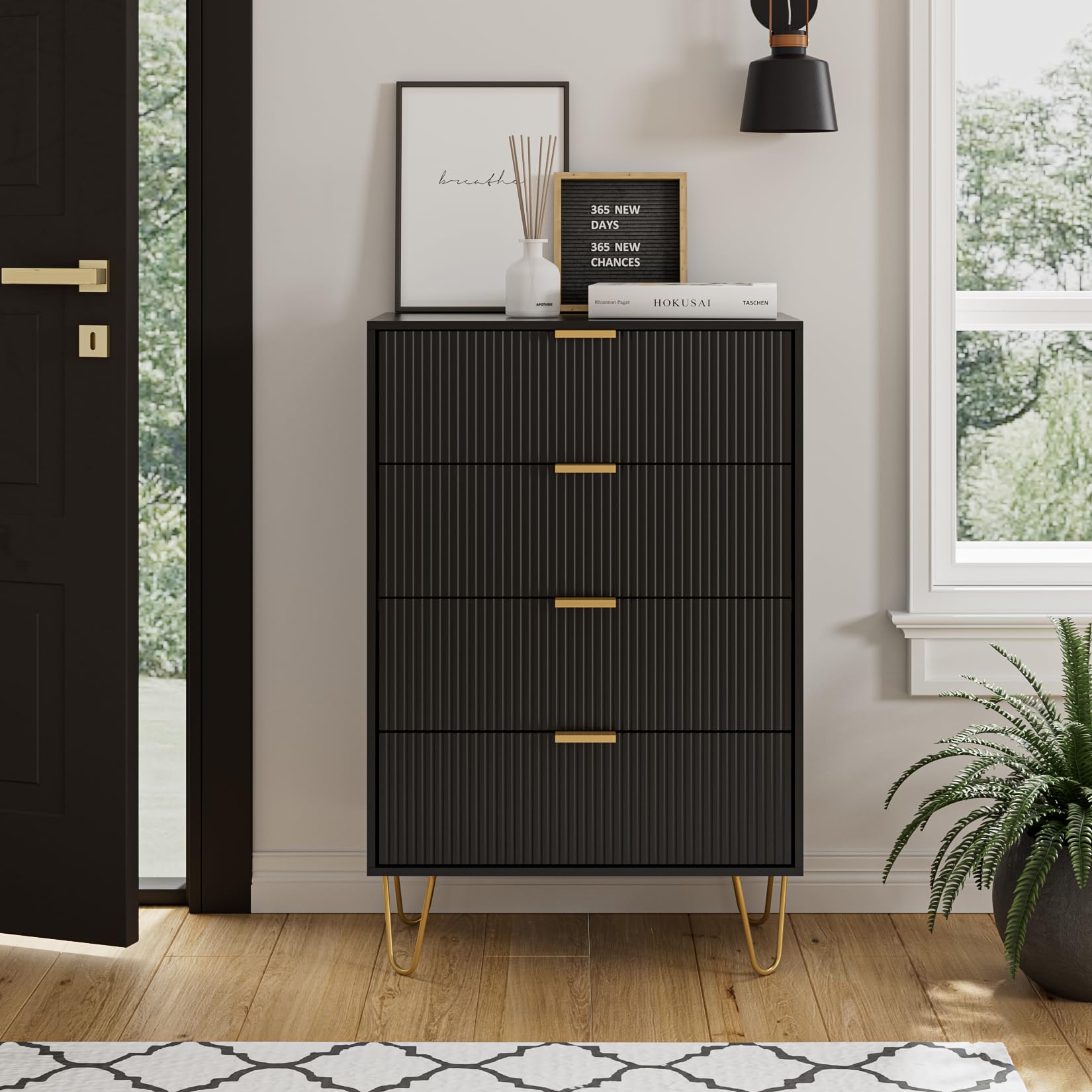 Image: The Masupu 4 Drawer Dresser, featuring a black finish with fluted drawer fronts and elegant gold metal legs and handles. This dresser offers a modern design suitable for various room settings.