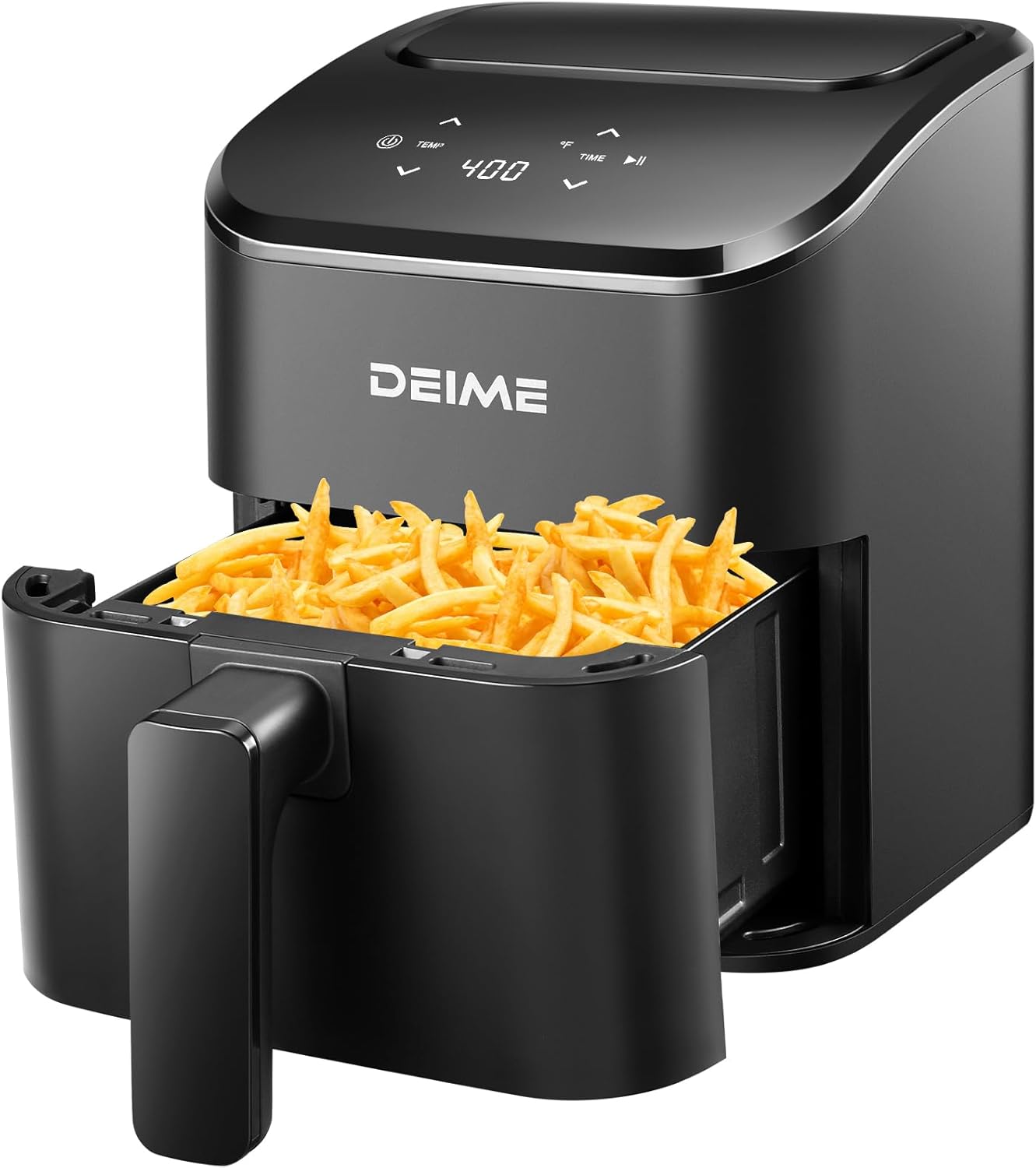 The DEIME 3 Qt Digital Air Fryer is designed for compact, efficient cooking. It features a digital control panel for precise temperature and time adjustments, and a non-stick, dishwasher-safe basket for easy cleaning.