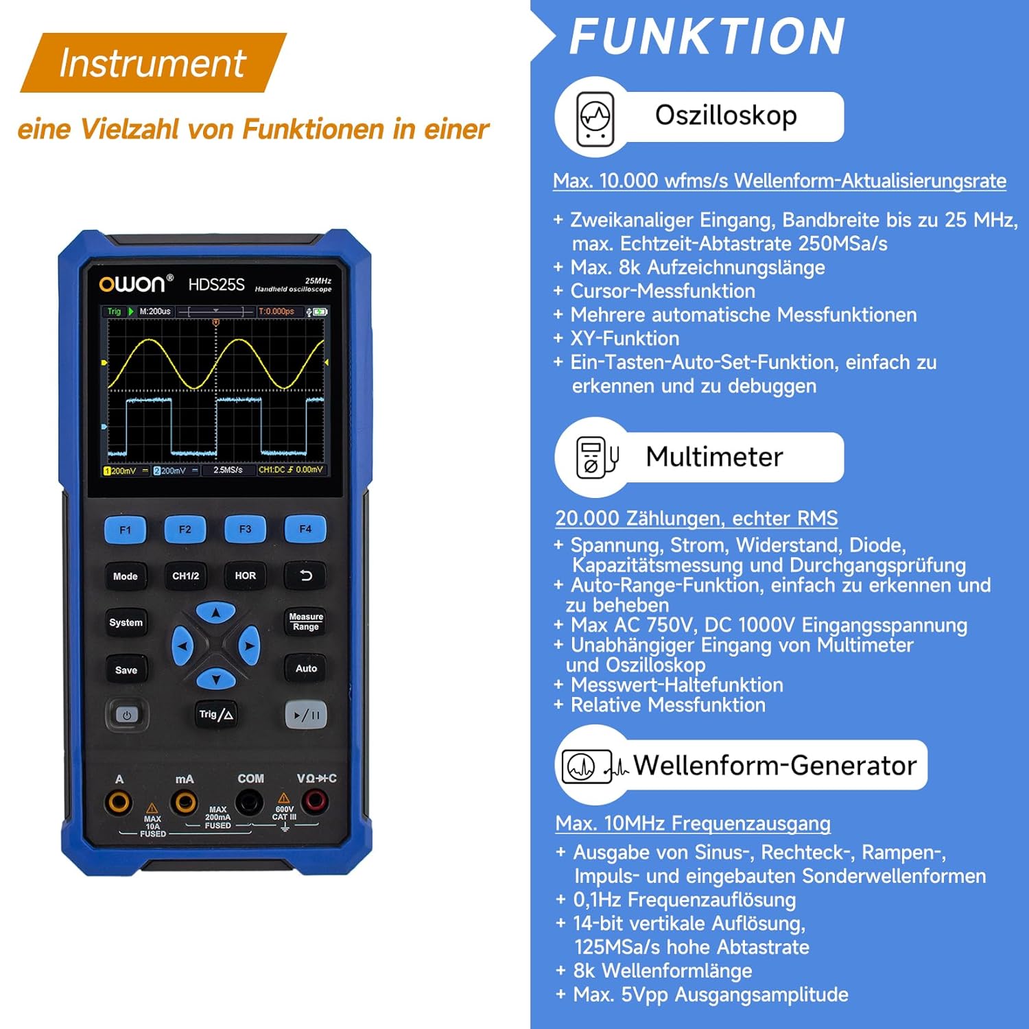 Welcome to the user manual for the OWON HDS25S Handheld Oscilloscope Multimeter. This device is a portable, 3-in-1 universal tester combining a digital oscilloscope, a 20,000-count multimeter, and a waveform generator. Designed for precision and versatility, it is suitable for various applications including vehicle diagnostics, industrial troubleshooting, and educational experiments.