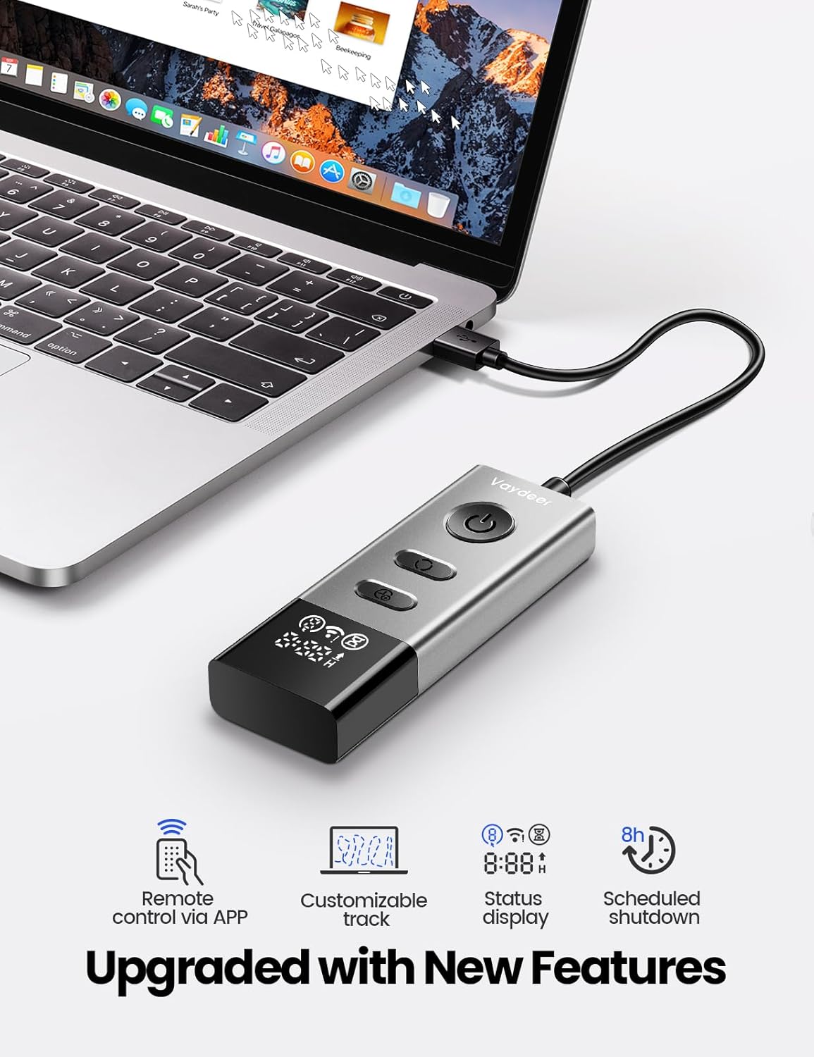 Figure 4.1: Vaydeer S5 Pro Mouse Jiggler connected to a laptop, highlighting its upgraded features including remote control, customizable track, status display, and scheduled shutdown.