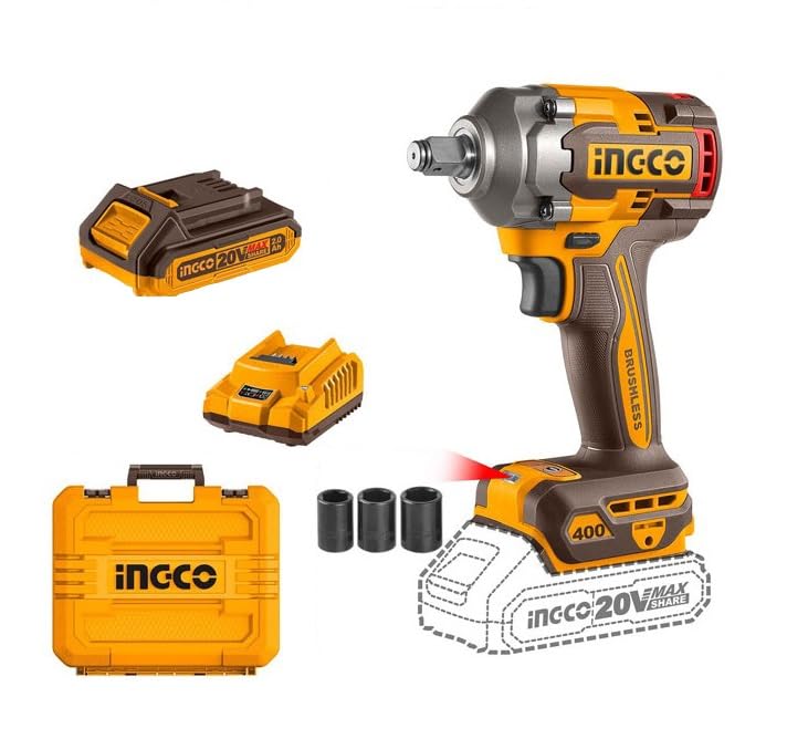 Figure 1: INGCO CIWLI2040 Cordless Impact Wrench with included batteries, charger, and sockets.