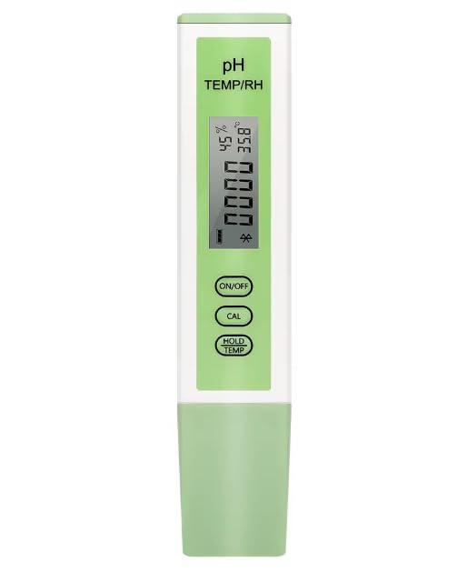 - HD LCD Screen: Displays pH, temperature, and humidity readings, battery level, and Bluetooth connection status.