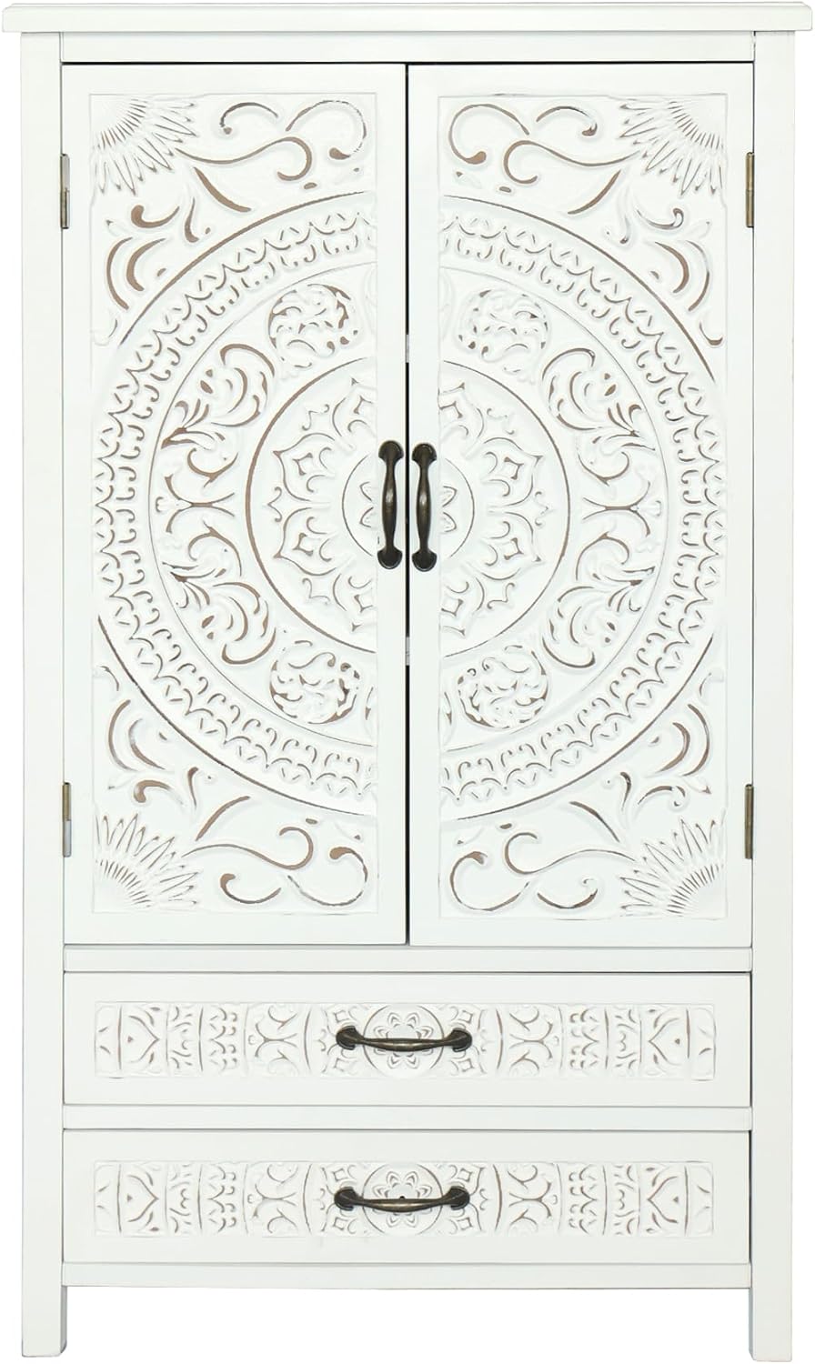 This cabinet measures approximately 48.23 inches in height, 26.77 inches in width, and 15.35 inches in depth. It is equipped with two exquisitely carved doors, one capacious bottom drawer, and three layers of internal storage space, offering abundant room for various items.