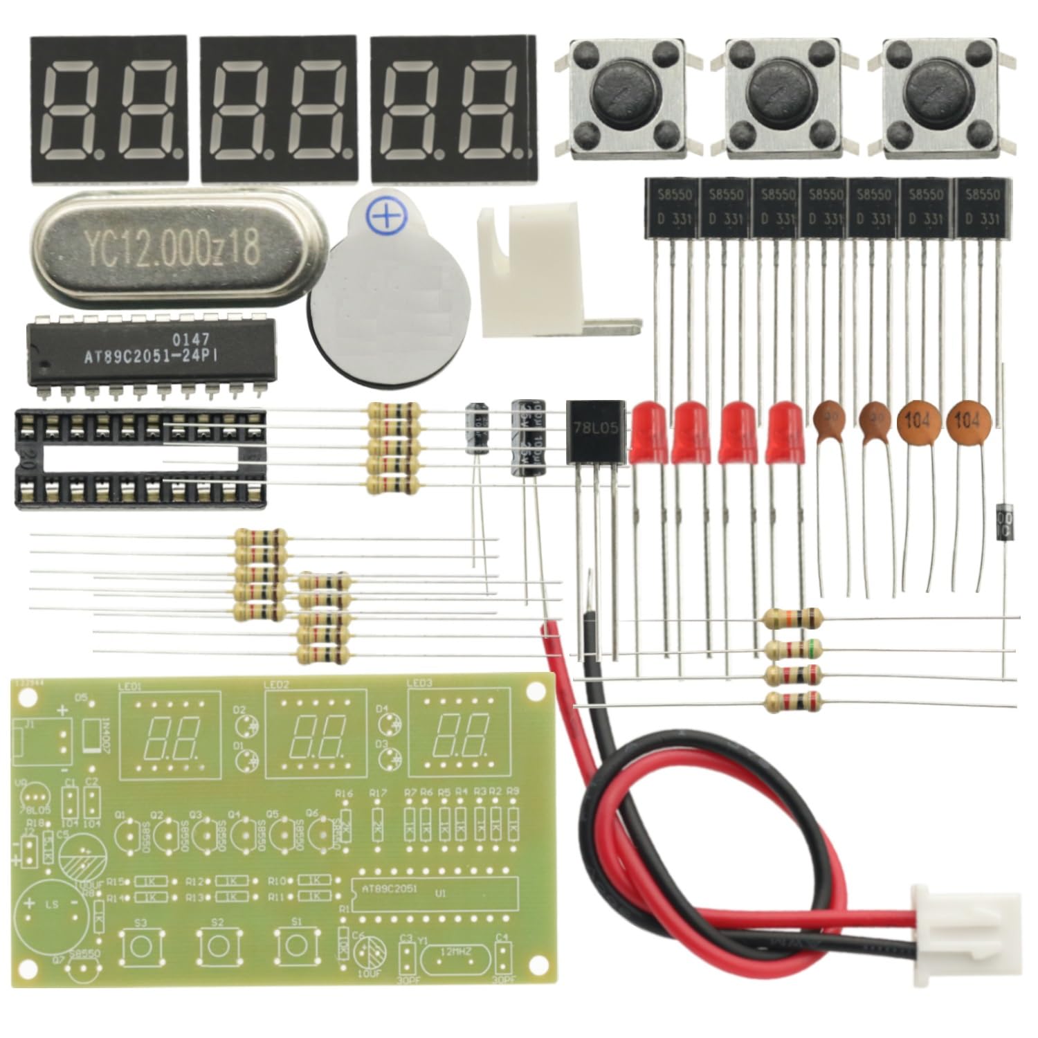 The kit includes all necessary components to build a functional 6-bit digital electronic clock with alarm capabilities. Key components include the AT89C2051 microcontroller, FR-4 PCB, 7-segment digital displays, resistors, capacitors, transistors, and a buzzer.