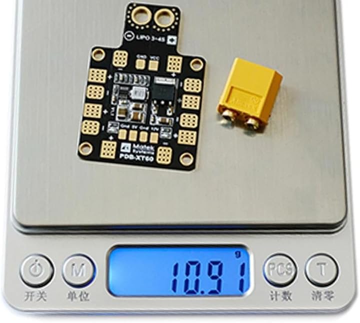 Image: The PDB XT60 board and its XT60 connector being weighed on a digital scale, indicating a total weight of 10.91 grams.