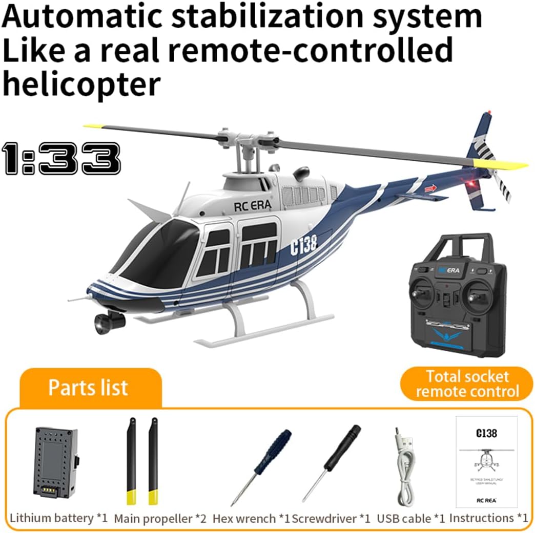 The GoAssemb RC ERA C138 Bell 206 No Aileron Helicopter is a 1/33 scale remote-controlled aircraft designed for stable and precise flight. It incorporates advanced technology to enhance the user experience, making it suitable for both beginners and experienced pilots.