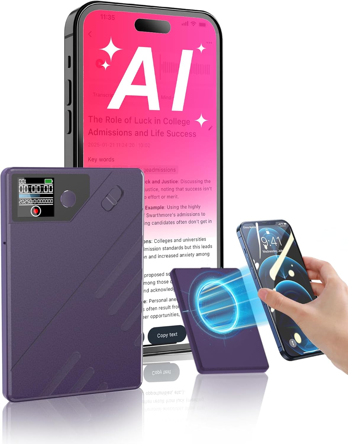 Image 1.1: The Powate AIVI-01 AI Voice Recorder alongside a smartphone showing its transcription feature.
