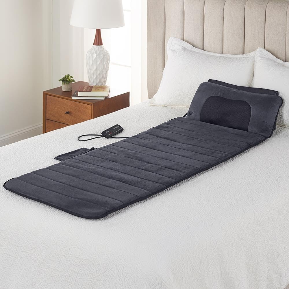 Image: The full body massage mat, including the detachable pillow and remote control, laid flat on a white bedspread, ready for use.