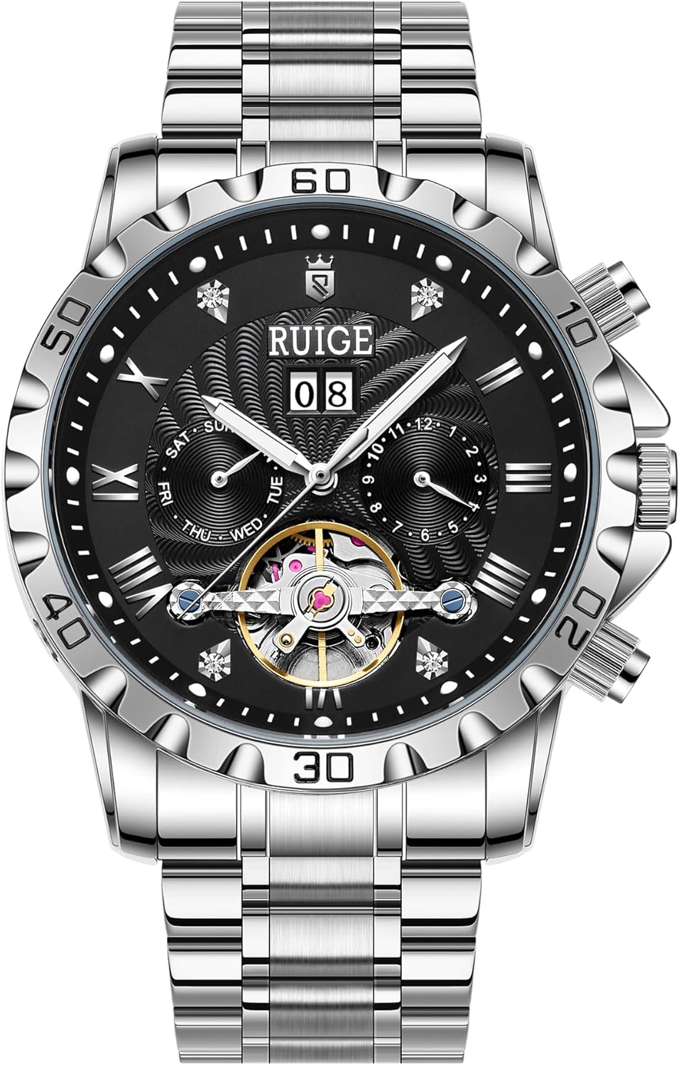 The RUIGE A3 is a sophisticated automatic mechanical watch featuring a distinctive hollow dial design, multiple sub-dials for day, date, and month, and luminous hands for visibility in low light. It is powered by your natural wrist motion, eliminating the need for batteries.