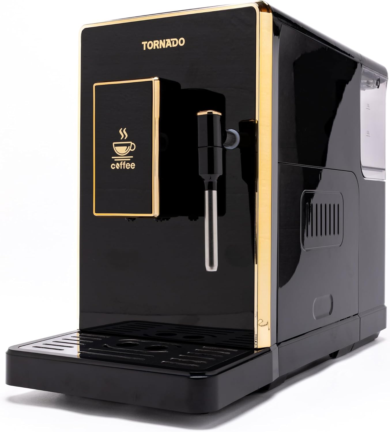 Figure 3.1: Front view of the Tornado TCM-9008A-GS Automatic Espresso Machine, showcasing its sleek black design with gold accents, control panel, and coffee dispenser.