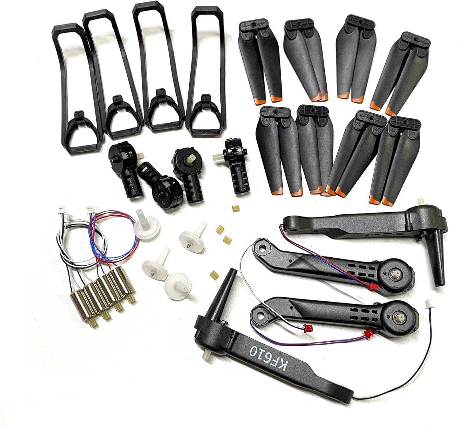 Figure 2.1: Complete set of KF610 Z908 Pro drone spare parts, including arms, propellers, motors, and protective guards. This image displays various components such as four drone arms (two black, two grey), multiple sets of black propellers with orange tips, four propeller guards, several small motors, gears, and other small connectors.