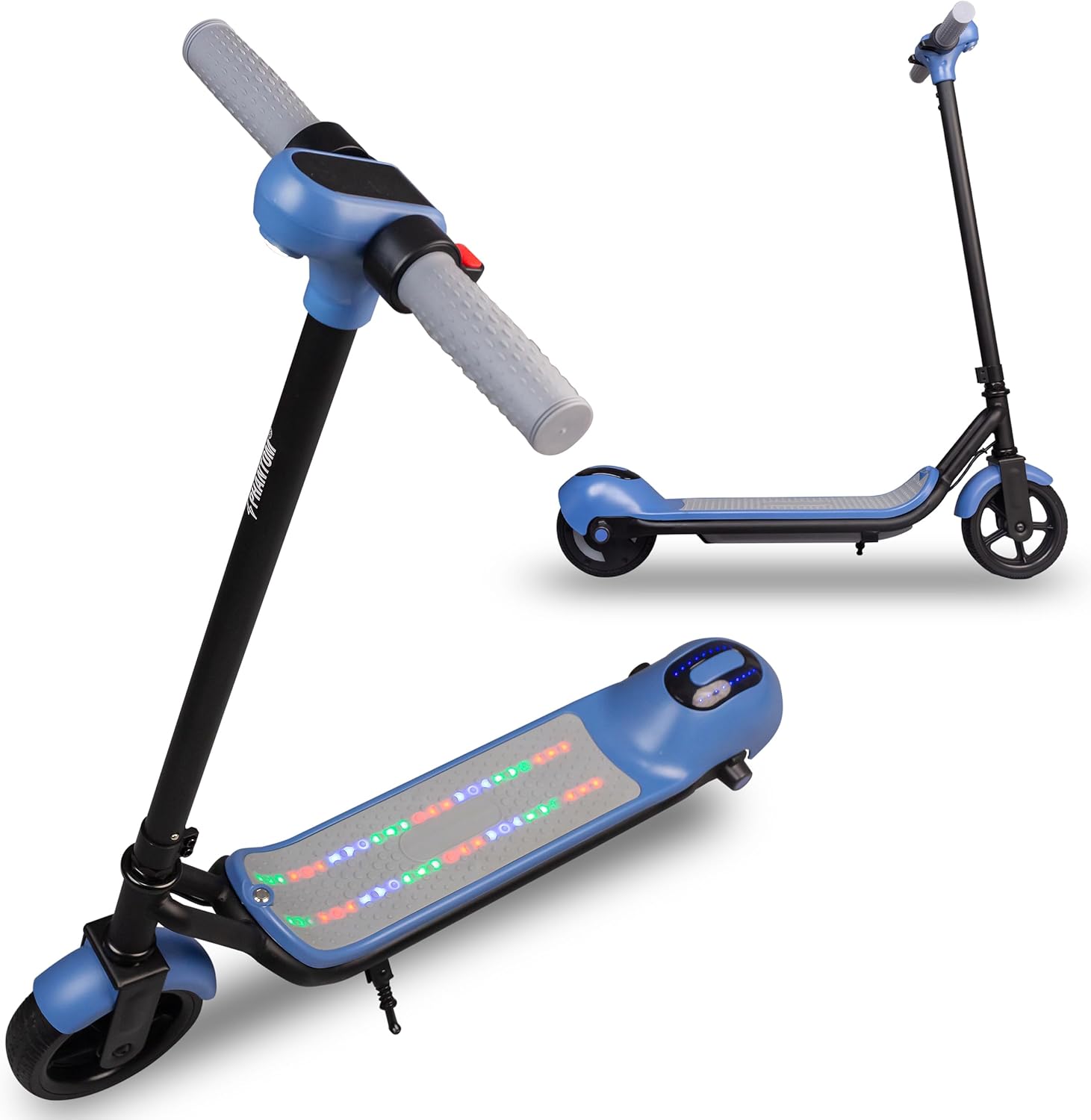 The Phantomgogo Model Y2 is a lightweight electric scooter featuring an 80W motor, a 21.6V lithium battery, LED display, and colorful light-up wheels. It is designed for recreational use and short commutes, offering a maximum speed of 9.3 mph and a range of 3-5 miles.