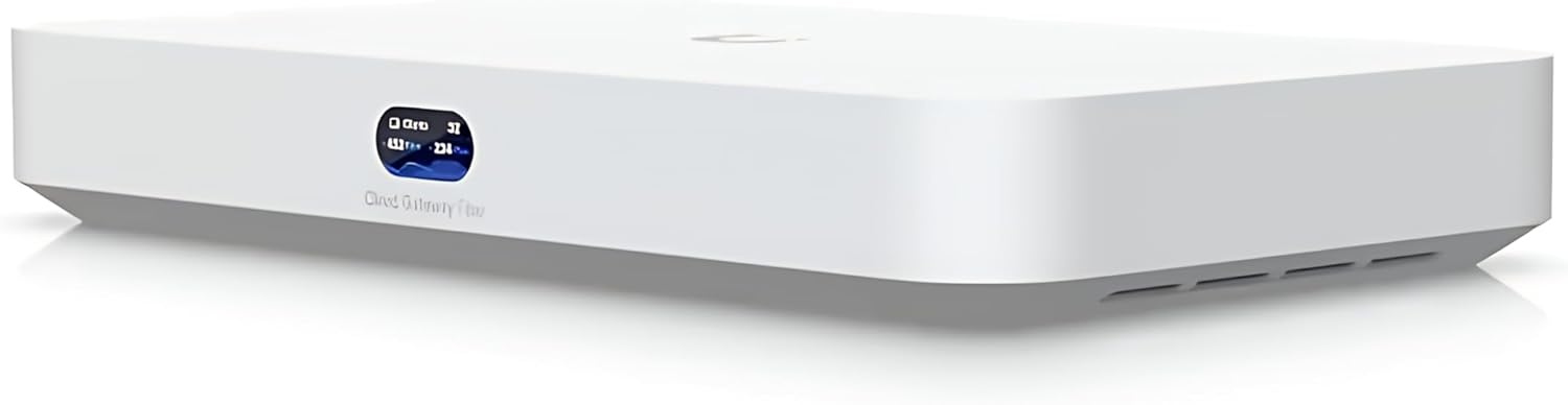 Figure 1: Front view of the UniFi Cloud Gateway UCG-Fiber, showcasing its compact design and front display.