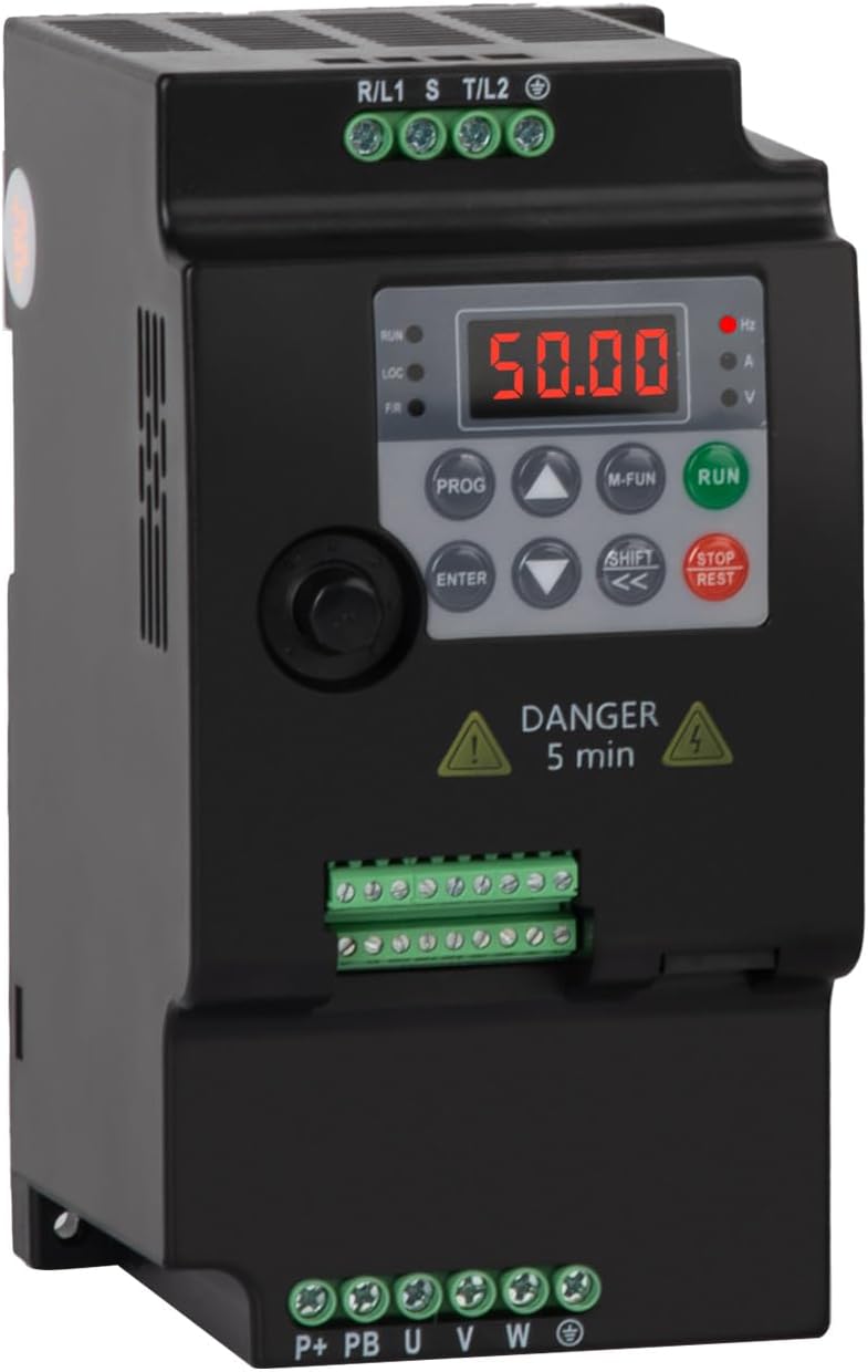 Figure 2.1: Front view of the VFD, showing the digital display, control buttons, and terminal blocks for power input and motor output. A "DANGER 5 min" warning label is visible, indicating the time required for capacitor discharge after power disconnection.