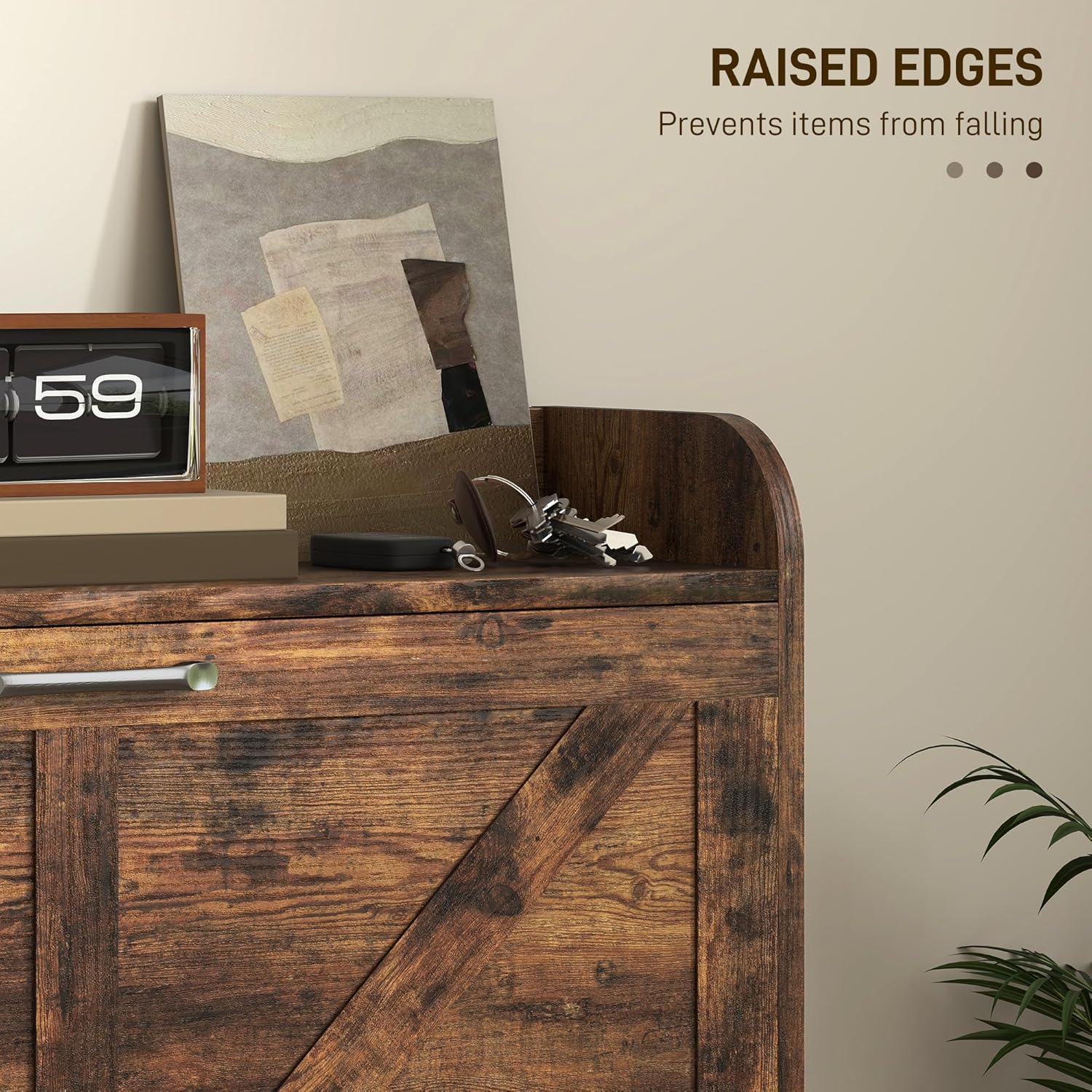 Image: Close-up of the cabinet's top surface, highlighting the raised edges designed to prevent items from falling.