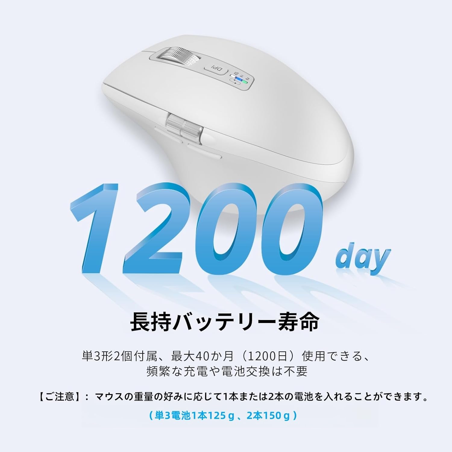 Image: The mouse is shown with a graphic indicating "1200 days" and "Long-lasting battery life," emphasizing the extended battery performance. The text below the image explains that two AA batteries are included and can be used for up to 40 months, with the option to use one or two batteries to adjust mouse weight.