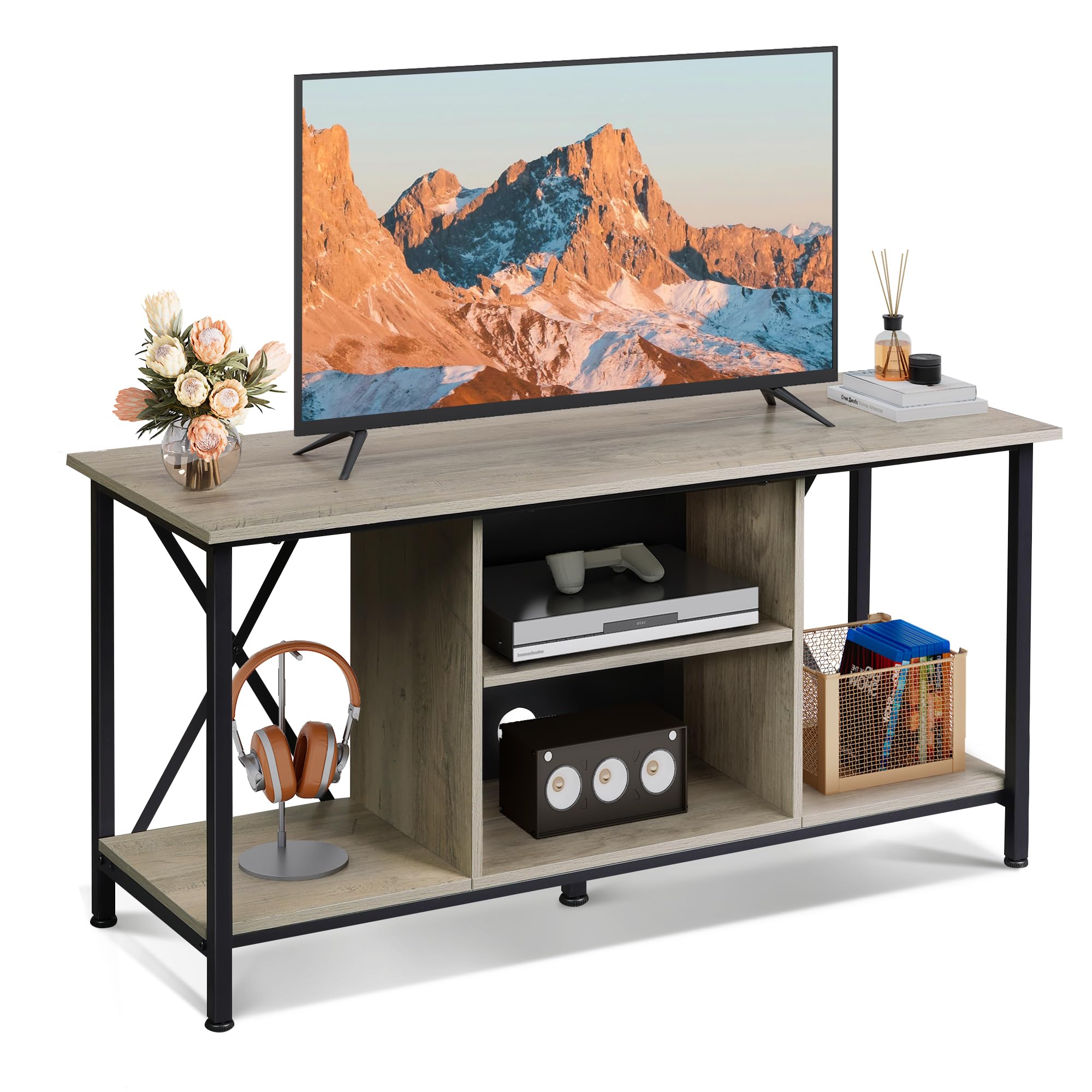 Image 1: The WLIVE Industrial TV Stand (41-inch, Greige) in a typical home environment. The stand features a greige finish with a black metal frame, offering open shelving for media devices and decor.