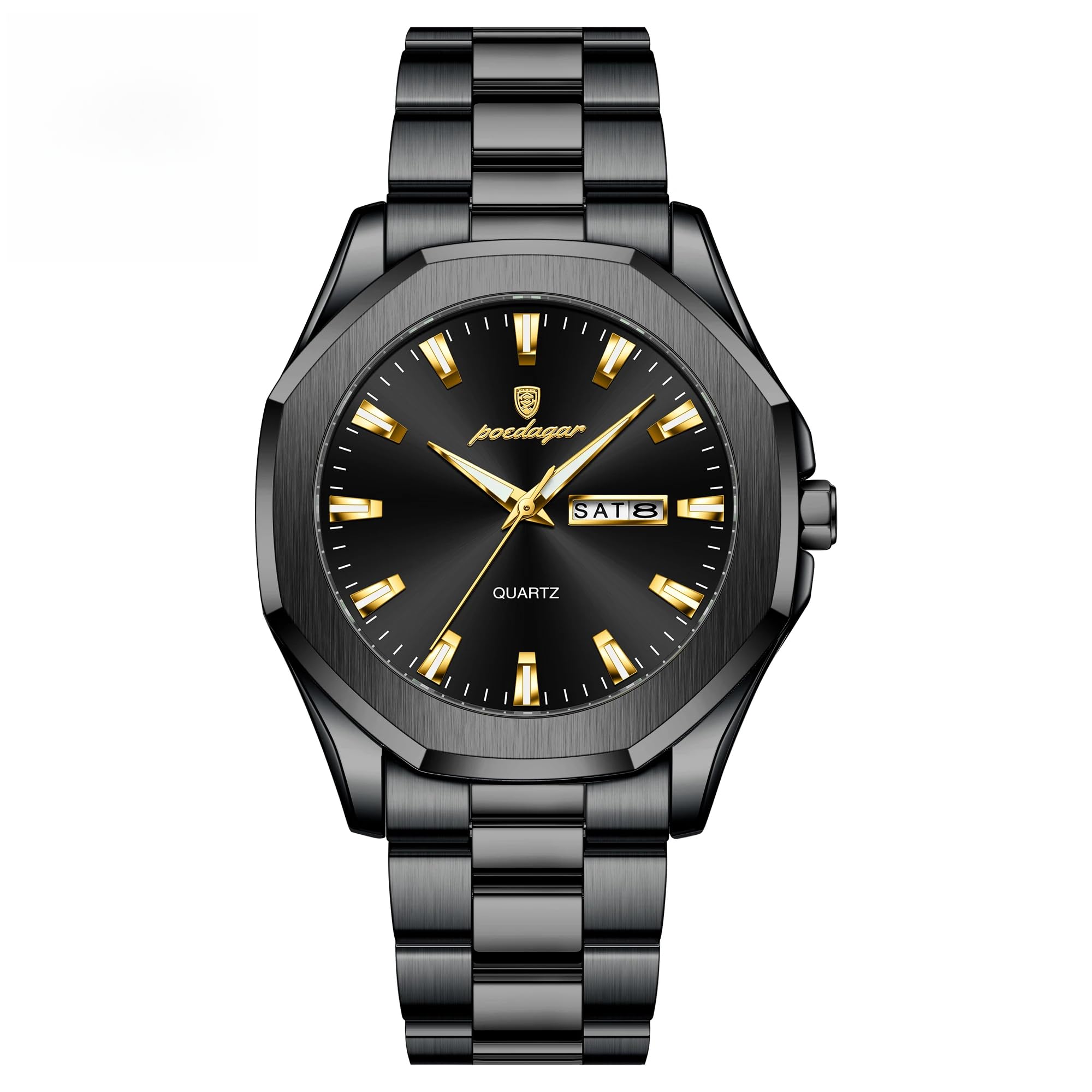 The Poedagar Model 875-9 is a luxury casual men's quartz wristwatch designed for precision timekeeping and durability. It features a stainless steel case and strap, a luminous analog display, and a week/date function. This watch is built to withstand daily use with its robust construction and water-resistant design.