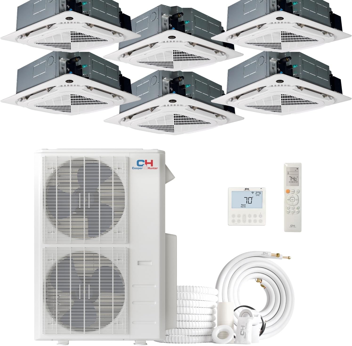 Image: Complete Cooper & Hunter 6 Zone Mini Split System, showcasing the six ceiling cassette indoor units, the large outdoor condenser unit, and the included remote controls and line sets.