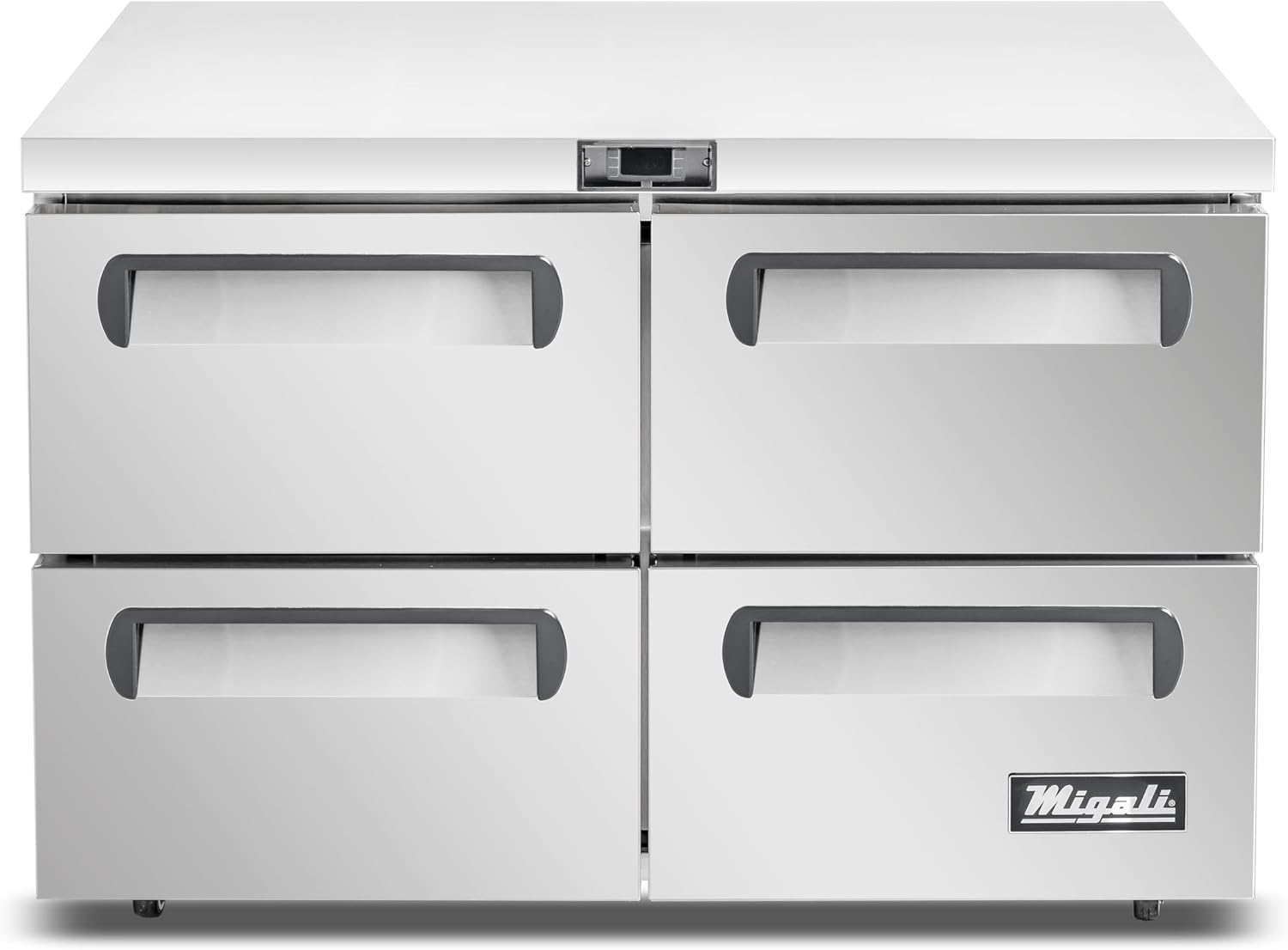 Image: Front view of the Migali C-U48R-D-HC under-counter refrigerator with four drawers, showcasing its stainless steel finish and digital display.