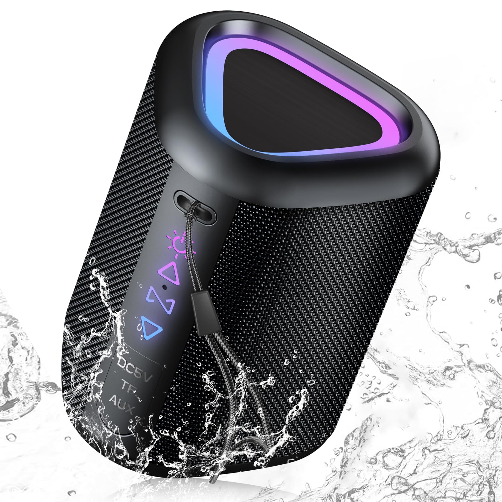 Image 1: Front view of the SOBERNA M10 Bluetooth Speaker. The speaker is black with a mesh-like texture on the sides. The top features an illuminated triangular panel displaying vibrant purple and blue LED lights. On the front, below the top panel, there are illuminated control icons and text indicating input ports like DC5V, TF, and AUX, suggesting charging, memory card, and auxiliary input options. Water splashes are depicted around the speaker, highlighting its IPX5 waterproof feature.