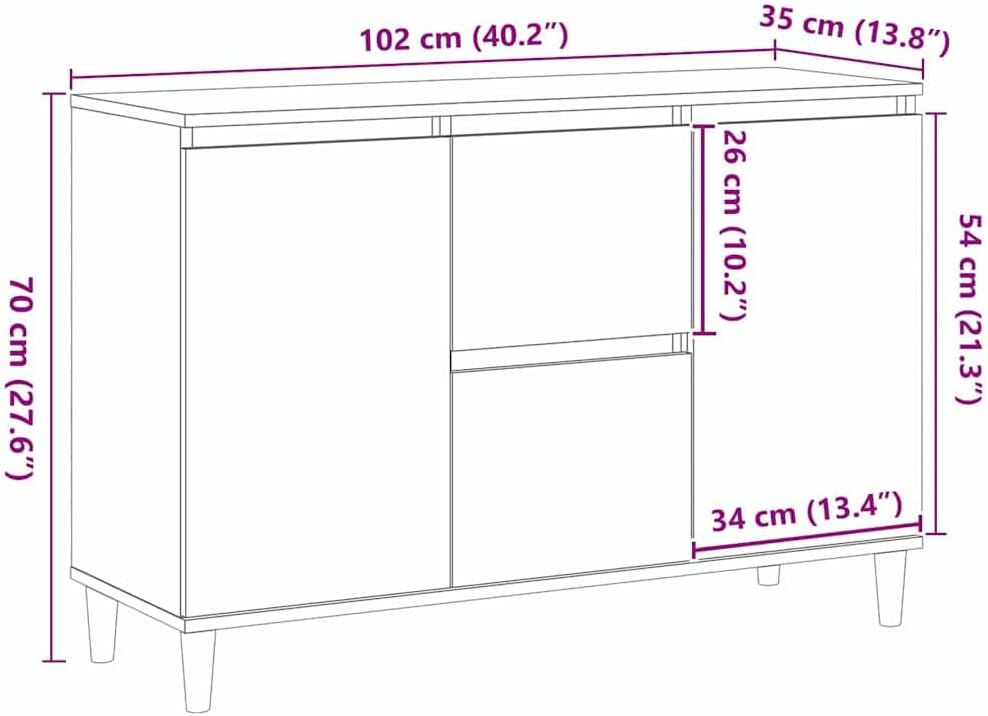 Image: Dimensional diagram of the sideboard, showing overall measurements of 102 cm (40.2 inches) width, 35 cm (13.8 inches) depth, and 70 cm (27.6 inches) height. Internal compartment heights are also indicated.