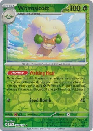 This manual provides essential information for the proper handling, care, and understanding of your Pokémon Whimsicott 008/131 Prismatic Evolutions Reverse Foil Single Card. This product is an authentic Pokémon Trading Card Game (TCG) collectible item.
