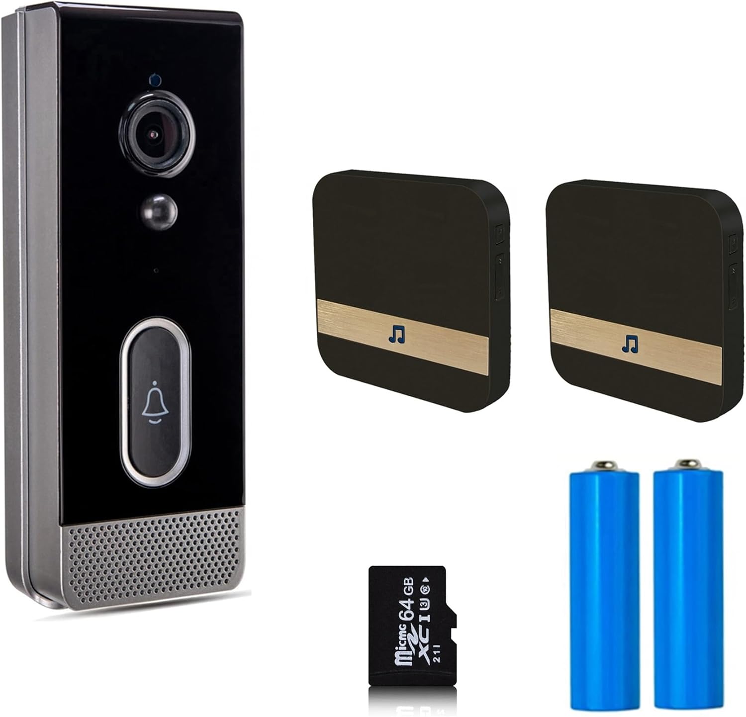 Image 1.1: Package contents including the doorbell, chimes, batteries, and Micro SD card.
