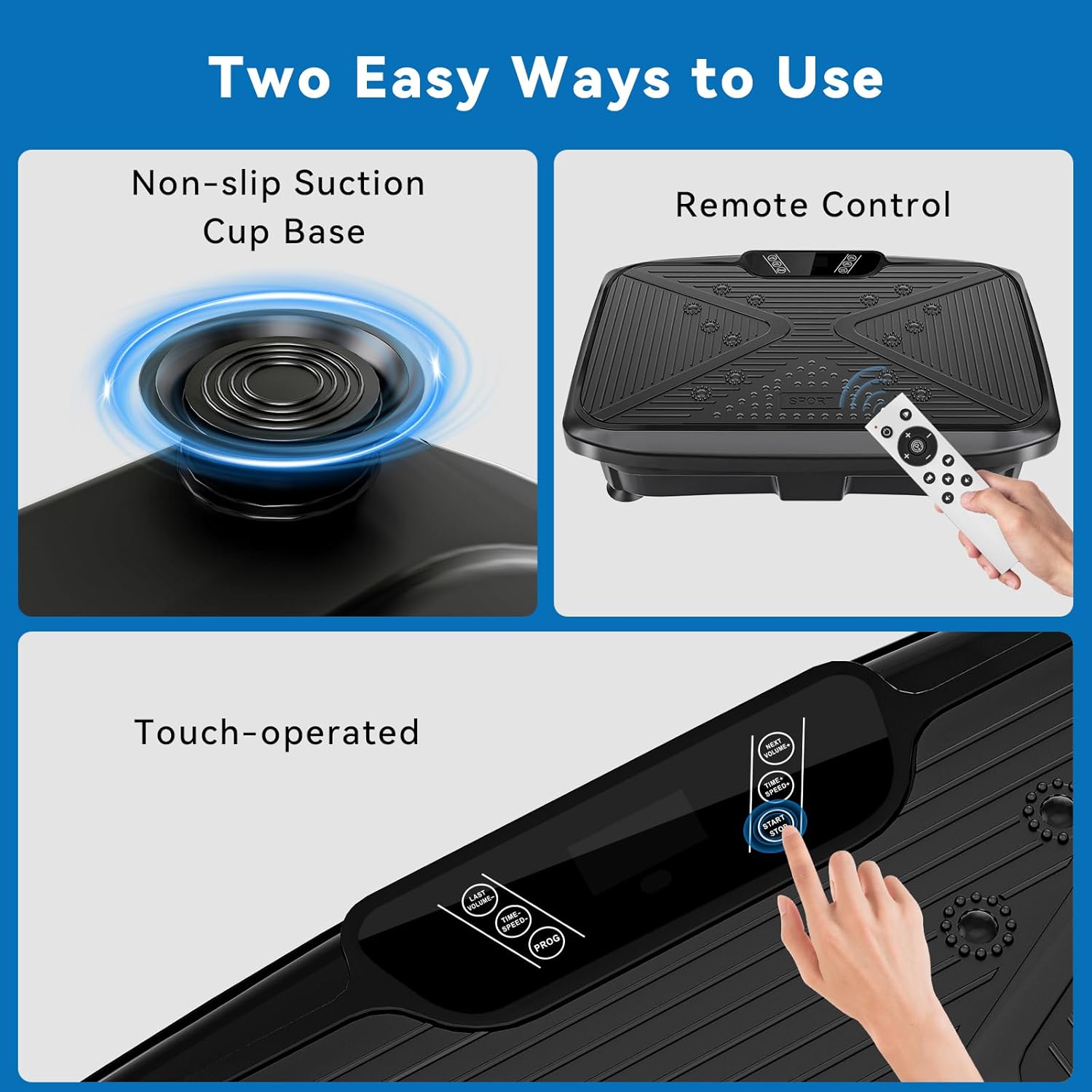 The vibration plate can be operated using either the integrated touch panel or the remote control. Regular use of the vibration plate may contribute to benefits such as decreased stress, increased core strength, improved mobility and flexibility, enhanced circulation, and relief from muscle pain.