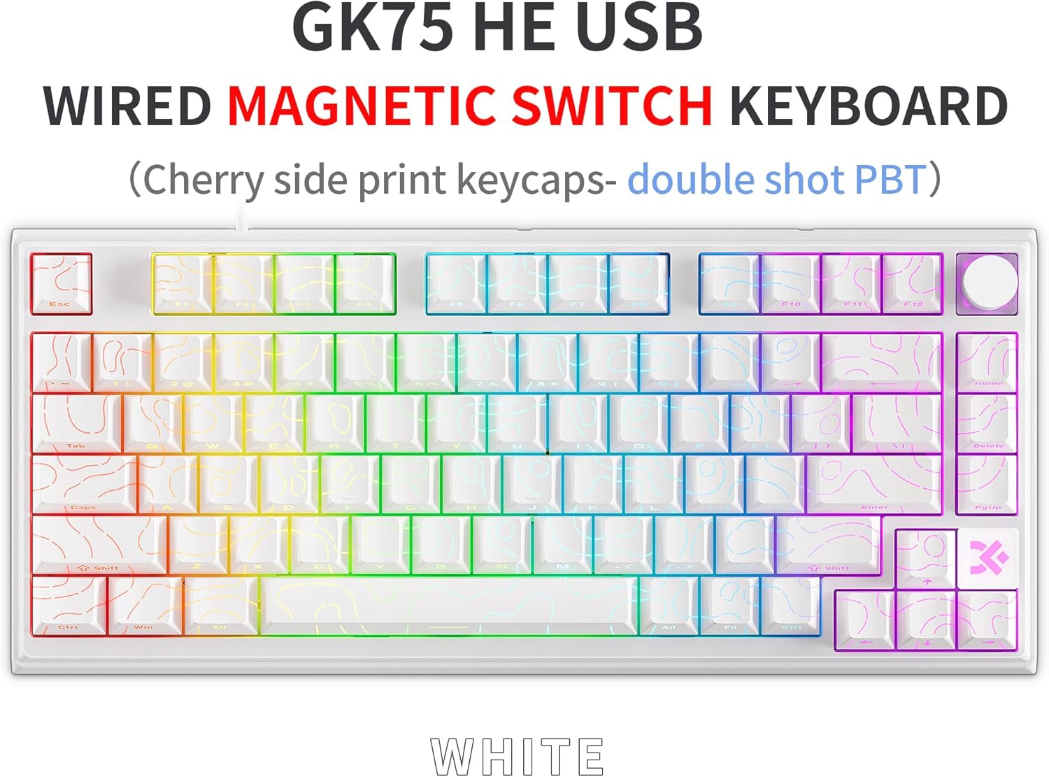 The GK75 HE features hot-swappable magnetic switches, allowing for easy replacement or customization without soldering. These switches utilize the Hall Effect for precise trigger sensitivity.