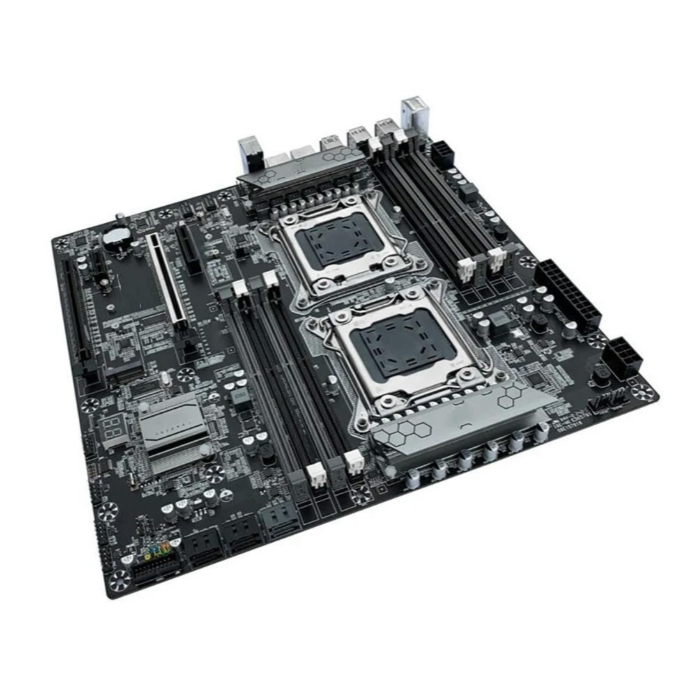 This image displays the Generic X79-D8 LGA 2011 E-ATX Motherboard from an angled top-down perspective. Key components visible include the dual LGA 2011 CPU sockets, multiple DDR3 RAM slots, PCI-E slots, SATA ports, and various power connectors and headers. The heatsinks covering the chipsets are also visible, featuring a hexagonal pattern.