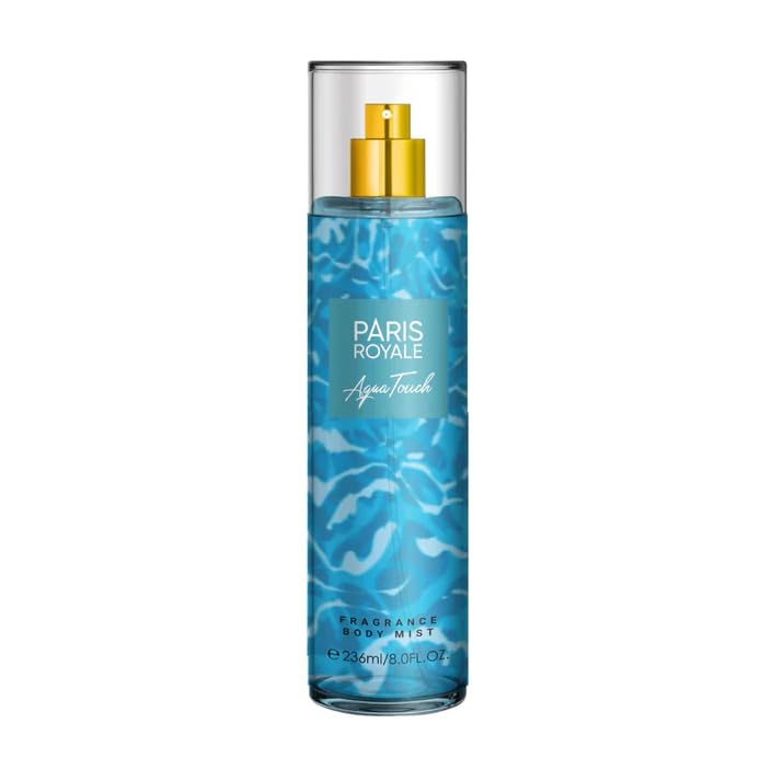 Image 1.1: Paris Royale Aqua Touch Body Mist bottle. This image displays the product packaging, a clear bottle containing blue liquid with a gold spray mechanism, and the product name clearly visible on the label.