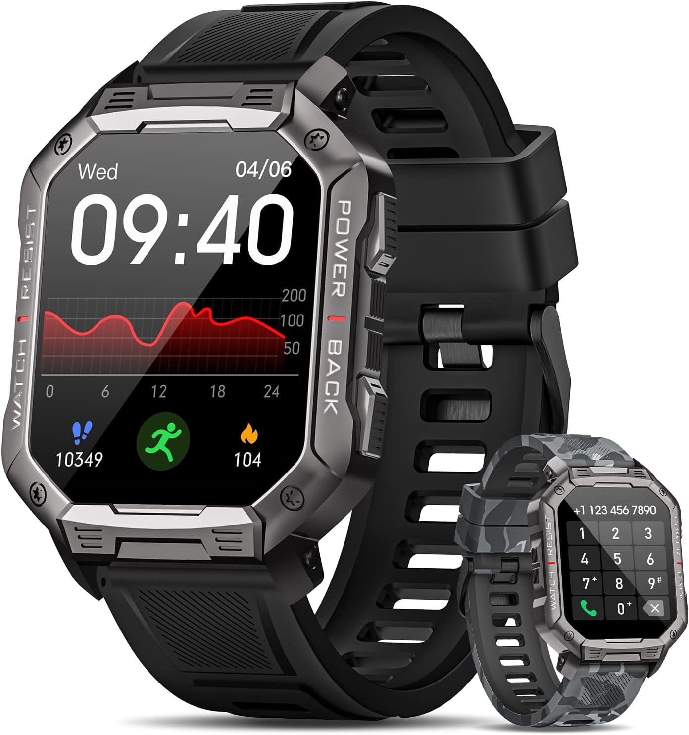 Image 1.1: The DEKELIFE G68 Smartwatch, showcasing its main display and two interchangeable strap options: a classic black silicone band and a camouflage silicone band. The watch face displays time, date, heart rate, steps, and calories burned.