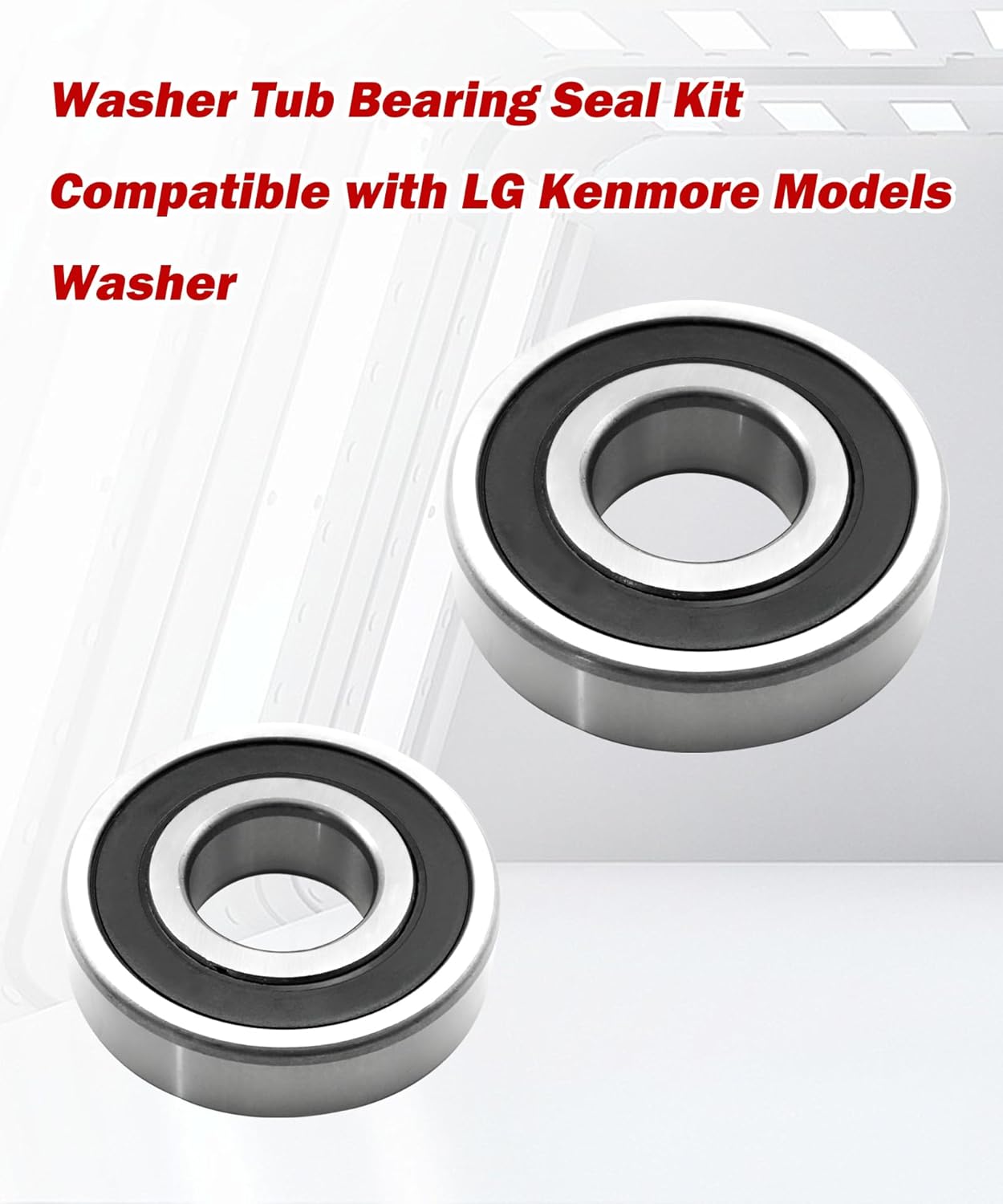 Image: The bearing and seal kit displayed in front of a washing machine, illustrating its purpose in resolving common washer issues like noise and leaks.