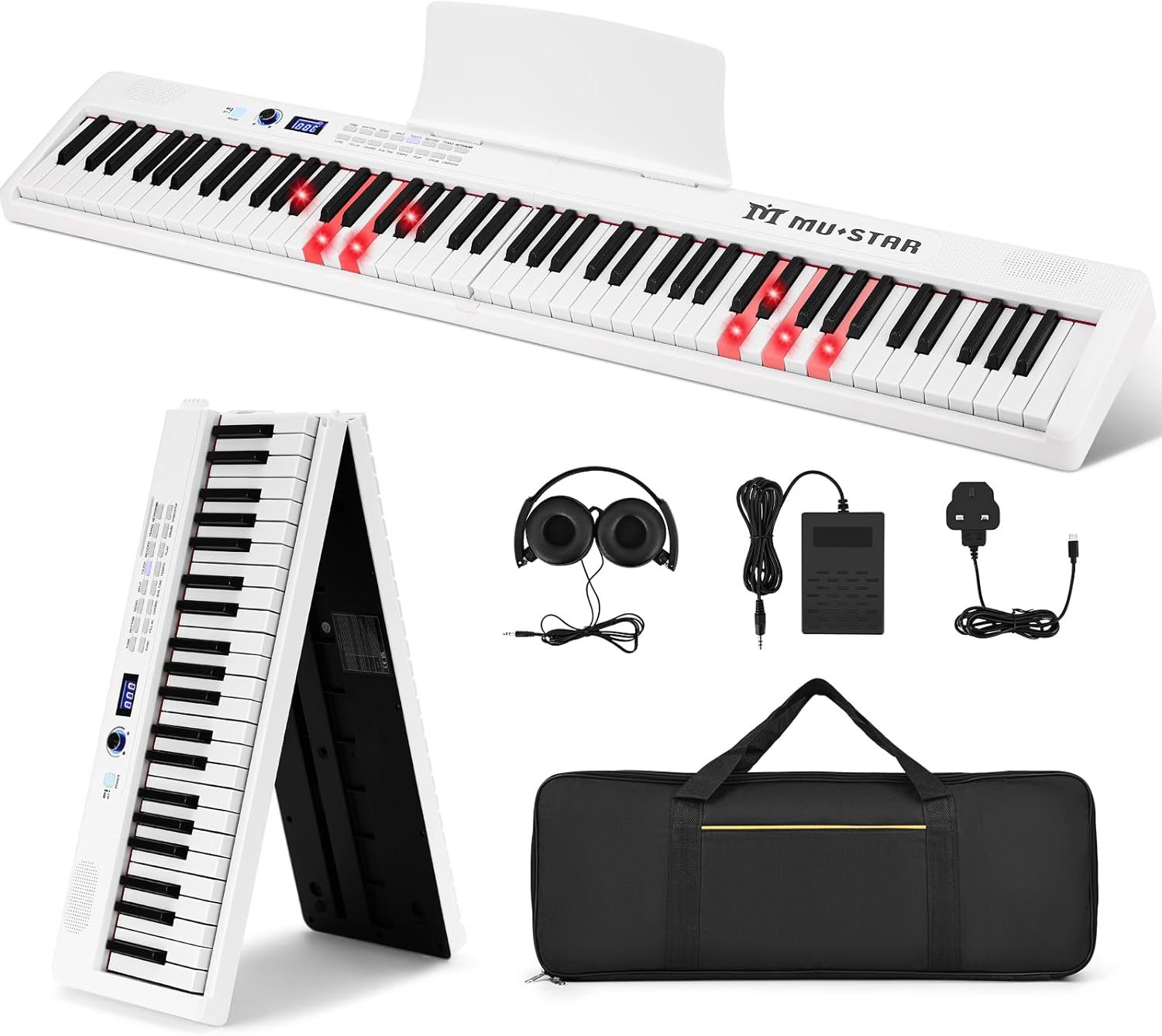 Thank you for choosing the MUSTAR 88 Key Piano Keyboard. This portable digital piano is designed for beginners and experienced musicians alike, featuring lighted keys for easy learning, semi-weighted keys for a realistic feel, and a foldable design for ultimate portability. This manual provides essential information on setting up, operating, maintaining, and troubleshooting your new instrument.