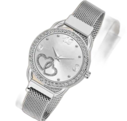 Image: Front view of the Diamond Analog Watch. This watch features a silver-toned mesh strap, a round silver dial with a crystal-studded bezel, and a unique design of two interlocking hearts on the dial. The watch has hour markers and three hands for hours, minutes, and seconds.