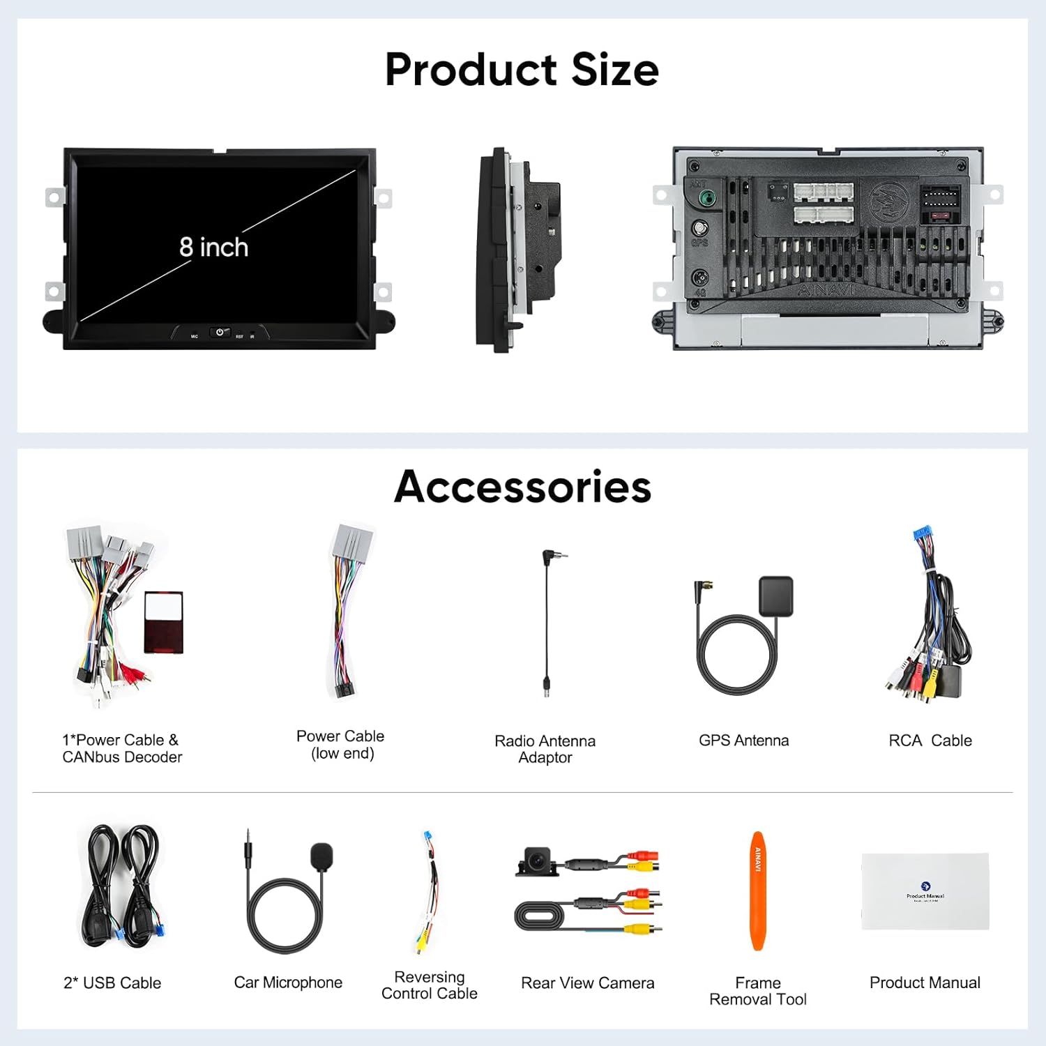 This manual provides detailed instructions for the installation, operation, and maintenance of your AINAVI 8-inch Android 12 Car Stereo Radio. This advanced multimedia system features an 8-inch QLED touch screen, Android 12 operating system, Octo-Core processor, built-in GPS navigation, 5G WiFi, Bluetooth 5.0, and support for both wireless/wired CarPlay and USB Android Auto. Please read this manual thoroughly before use to ensure proper functionality and to maximize your experience.