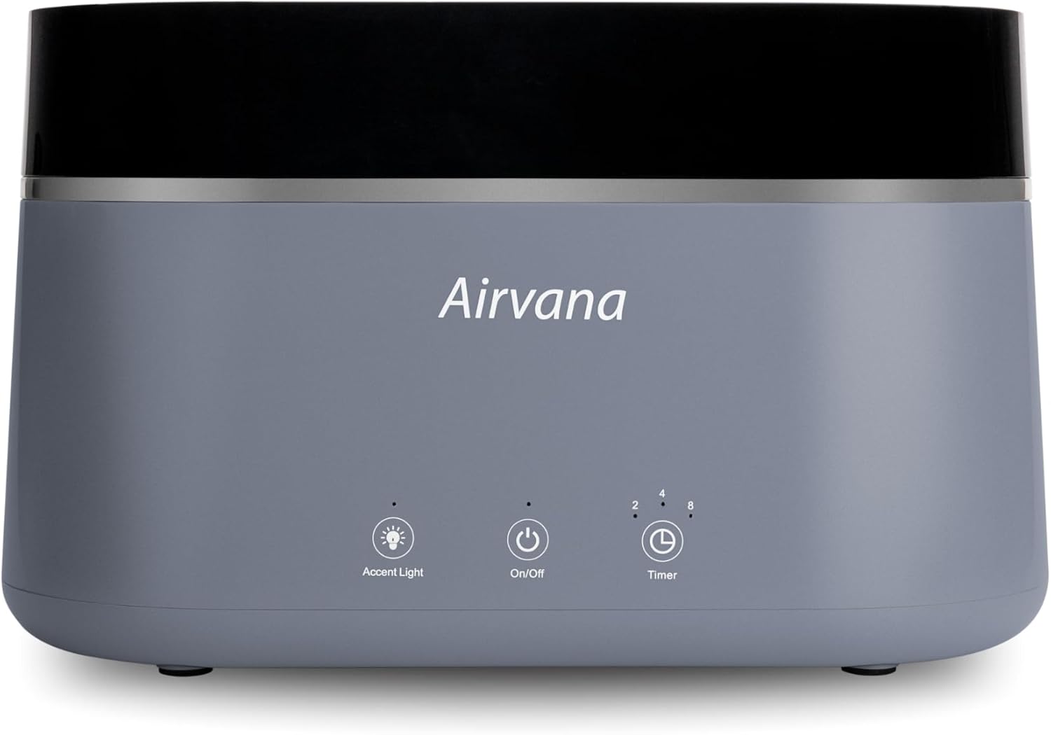 Figure 1: Front view of the Airvana AquaFlame Humidifier, showcasing its sleek design and soft-touch LED controls for accent light, power, and timer functions.