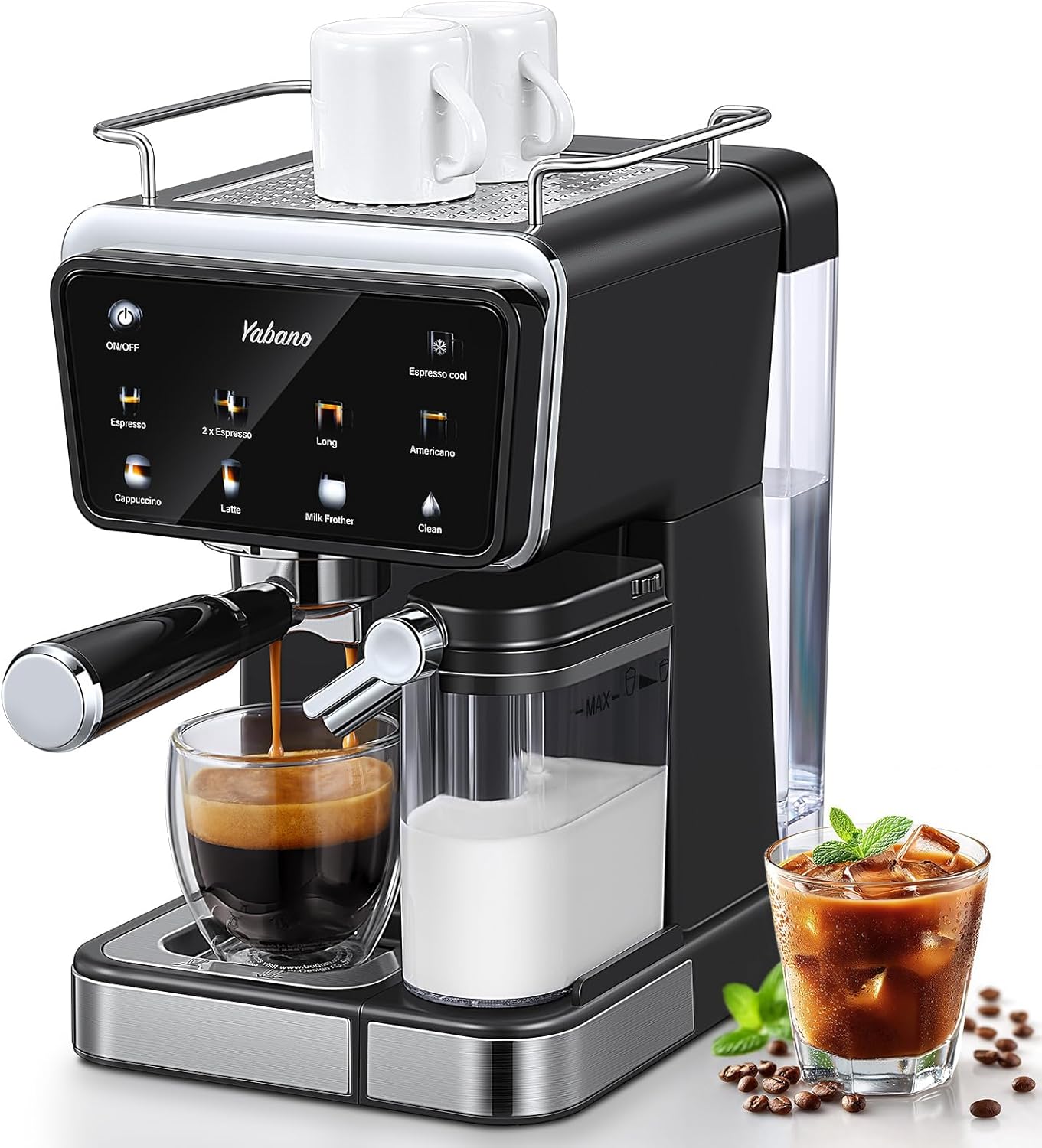 The Yabano Espresso Machine offers a variety of one-touch beverage options via its color touchscreen.