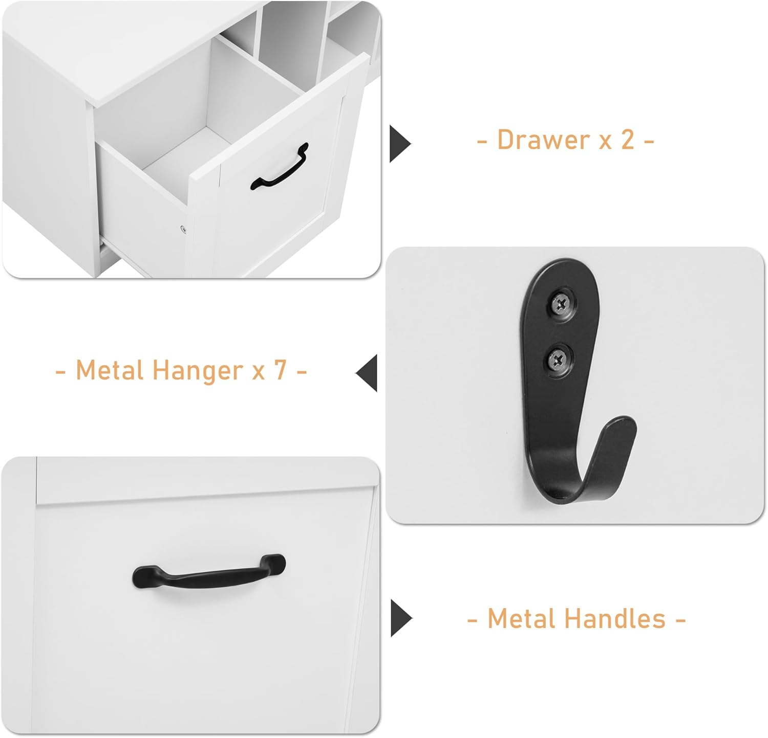Image: Close-up view of the hall tree's components, including the two drawers, seven metal hooks, and metal handles, illustrating the main parts included.