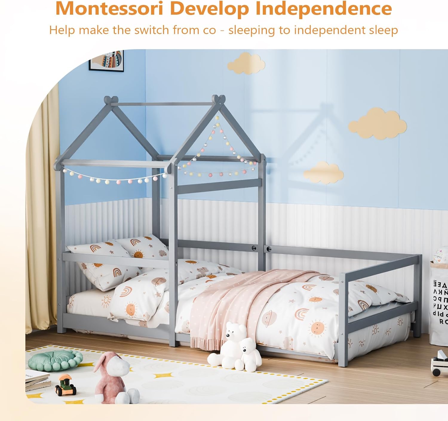The JOYMOR Twin Size House Floor Bed Frame is designed for children to promote independence and safe sleep. The low-to-ground design allows easy access for crawling or playing without the risk of falling from a height.