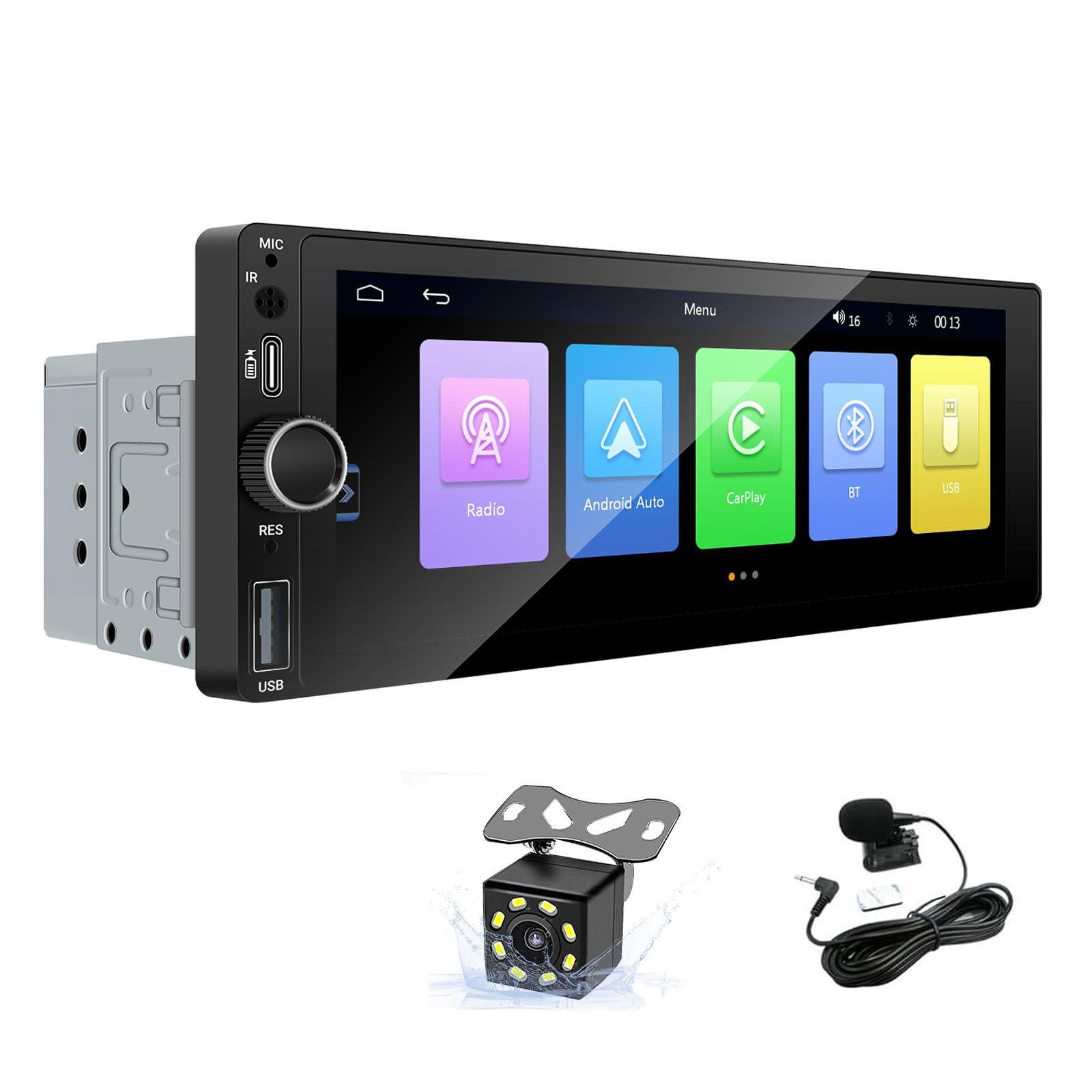 The LEXXSON RM-CP6801 is a single din car stereo featuring a 6.86-inch IPS touch screen. It supports Carplay, Android Auto, Mirror Link, FM radio, USB media playback, and includes an equalizer for audio customization.