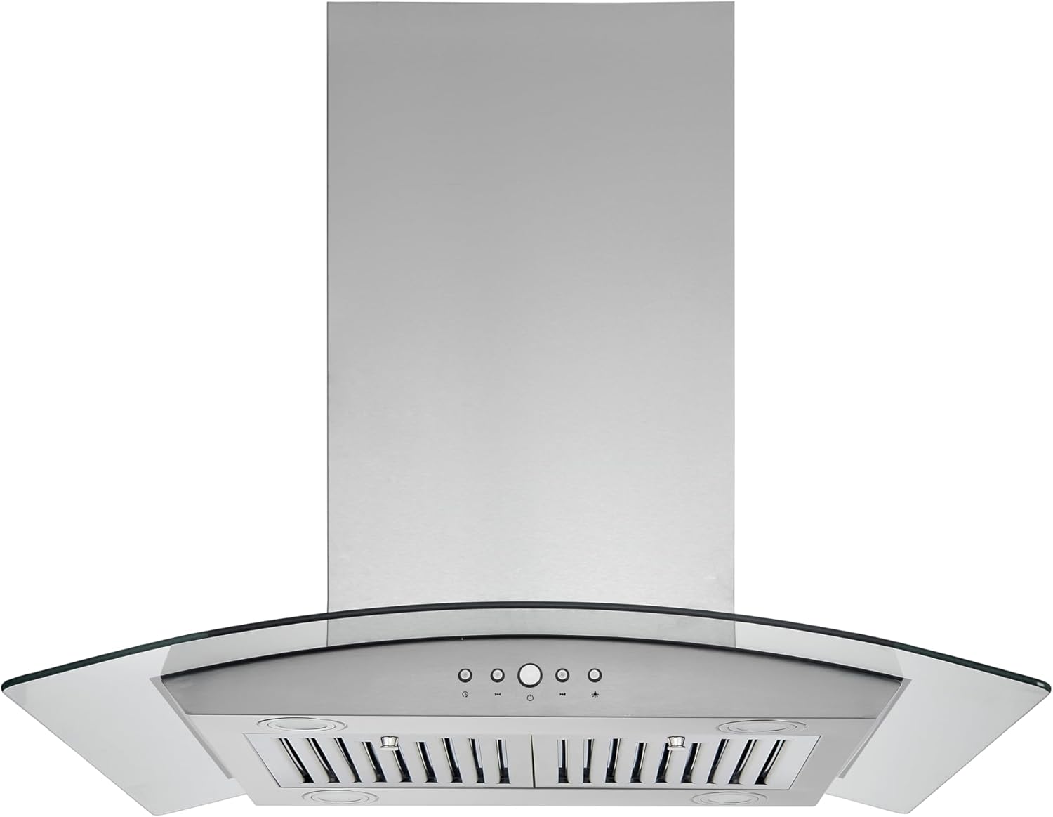 The control panel is located on the front of the hood and features push buttons for various functions. The dual control design allows operation from either side of your kitchen island.
