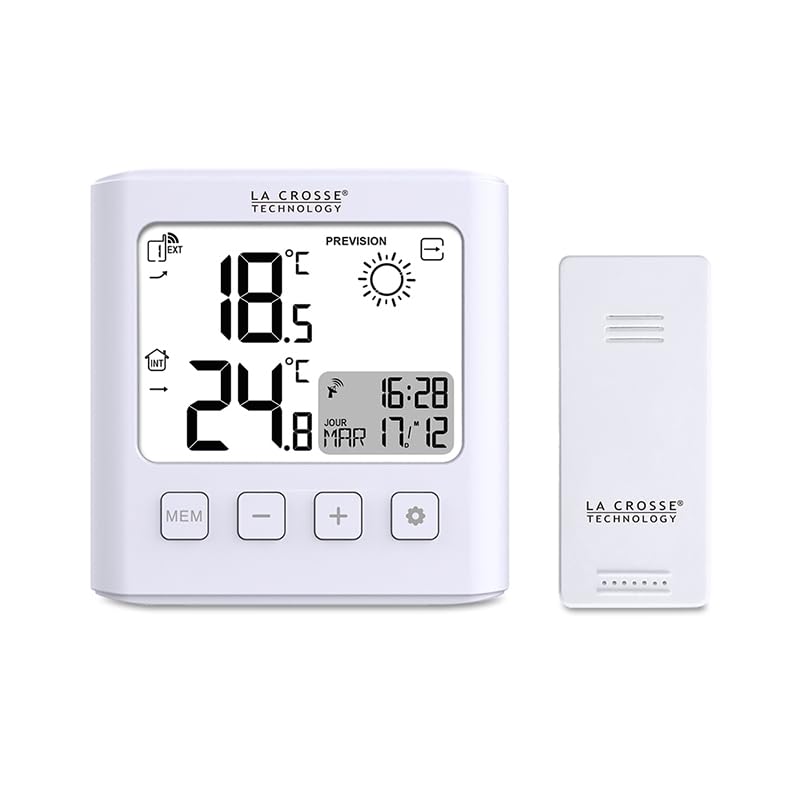 Image: The main display unit showing indoor and outdoor temperatures, time, and weather forecast icon.