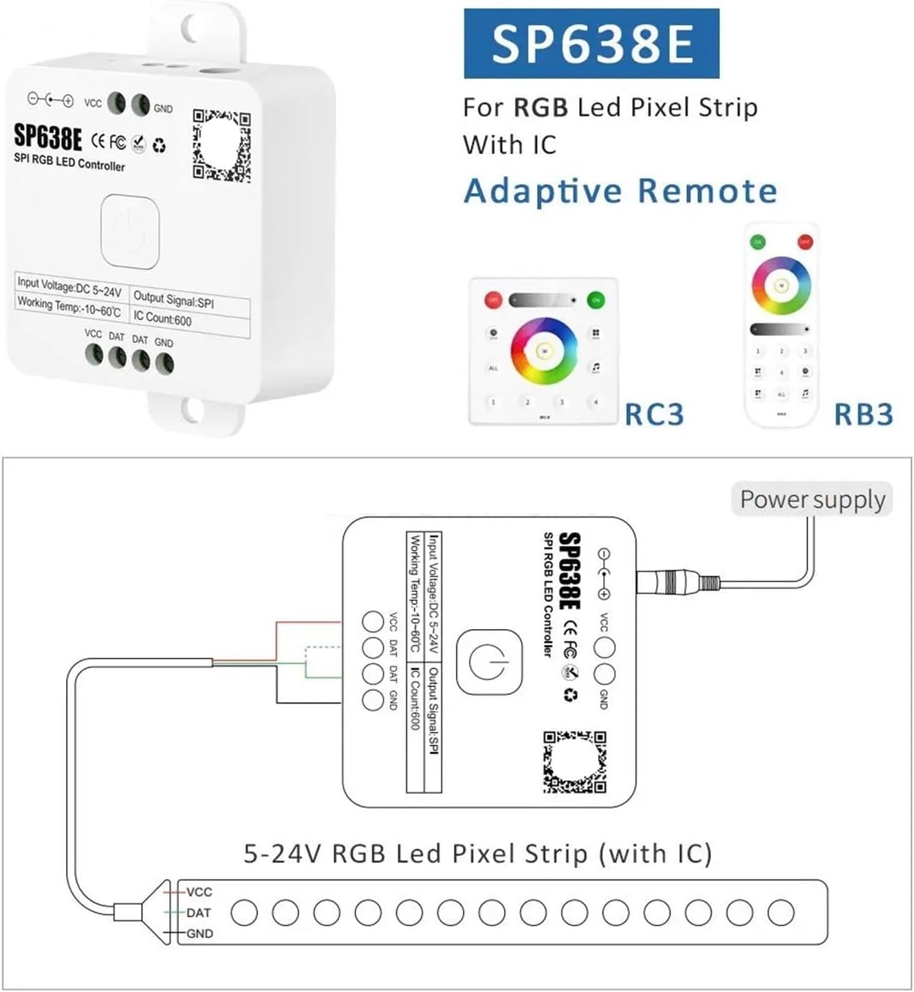 Note: Some LED strips may have additional pins (e.g., CLK). The SP638E is designed for SPI strips using DAT and GND. Refer to your LED strip's specific wiring requirements.